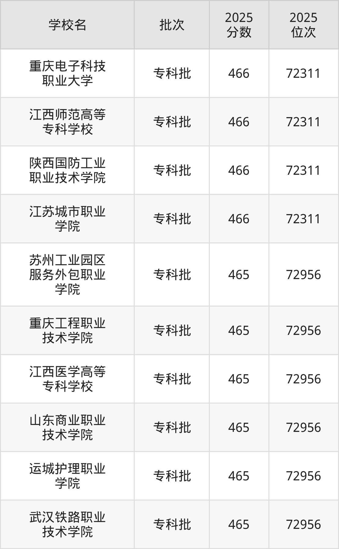 2025年河北高考历史类465分(72312名~72956名)能上的大学有重庆工程职业技术学院、江西医学高等专科学校、山东商业职业技术学院、苏州工业园区服务外包职业学院等。