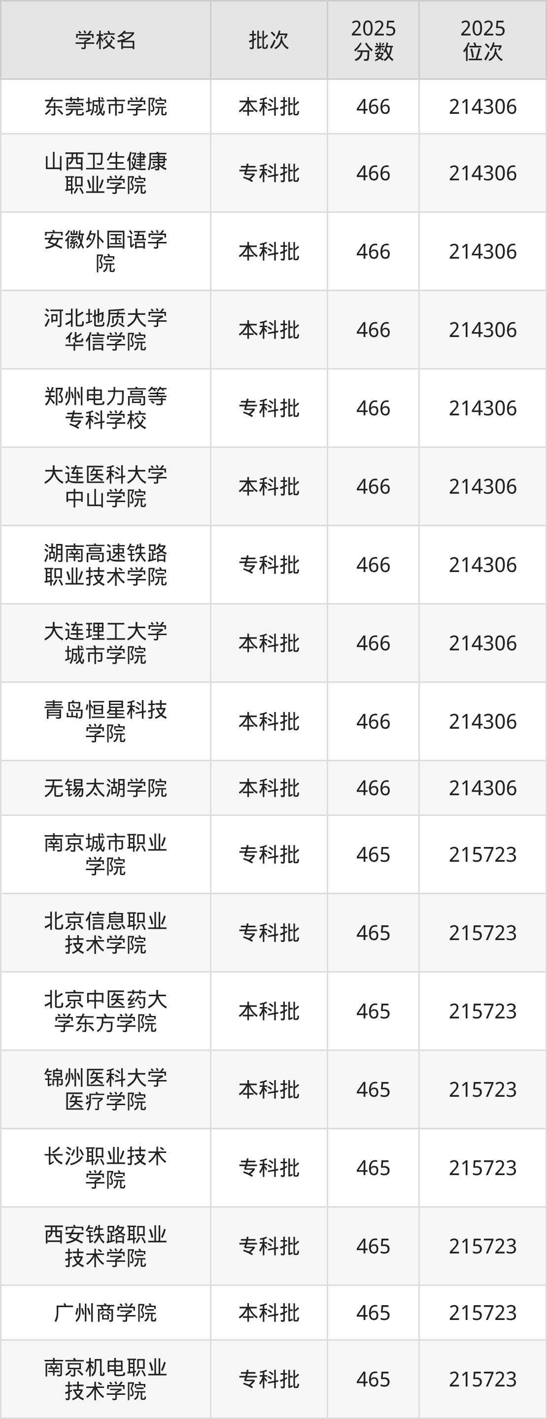 2025年河北高考物理类465分(214307名~215723名)能上的大学有锦州医科大学医疗学院、北京信息职业技术学院、南京机电职业技术学院、西安铁路职业技术学院等。