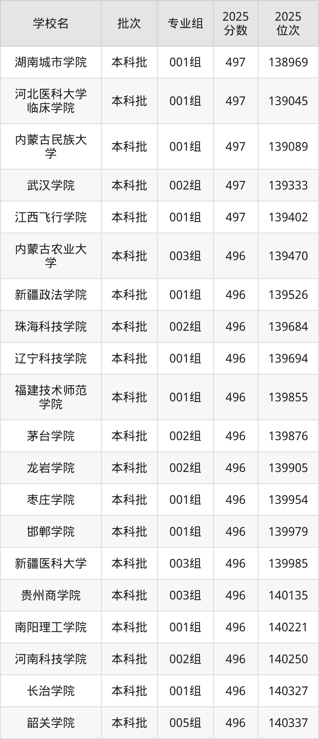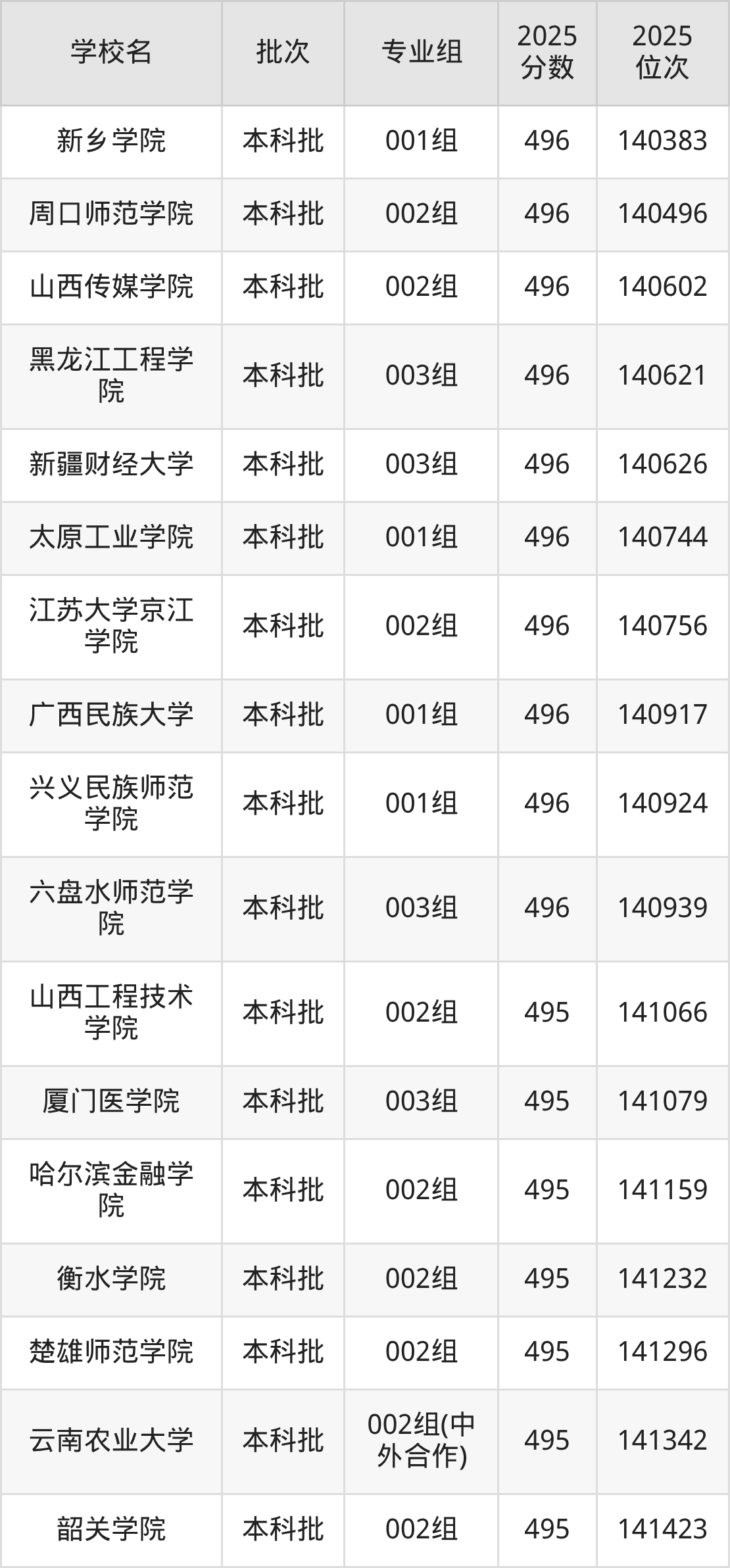 2025年安徽高考物理类496分(139470名~140985名)能上的大学有长治学院001组、福建技术师范学院001组、广西民族大学001组、贵州商学院003组等。