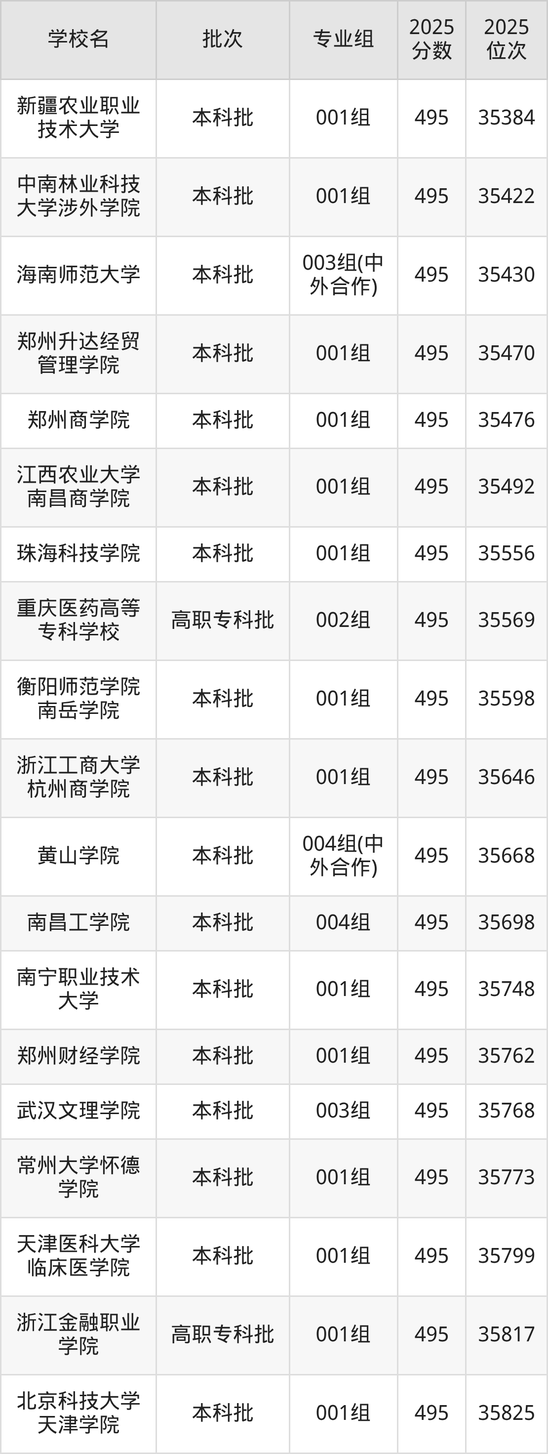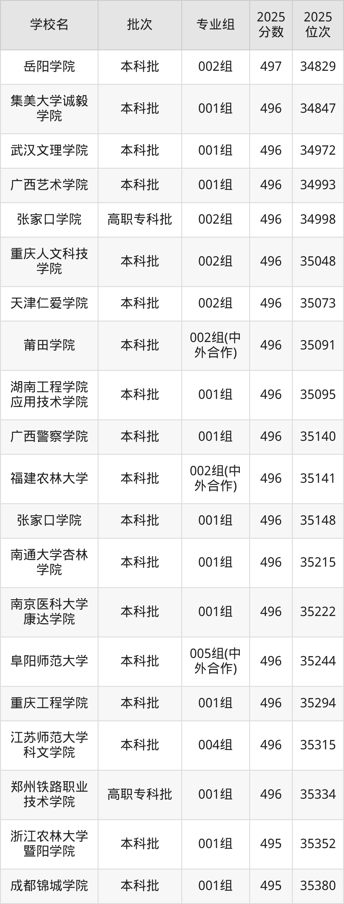 2025年安徽高考历史类496分(34846名~35339名)能上的大学有重庆工程学院001组、重庆人文科技学院002组、福建农林大学002组(中外合作)、广西警察学院001组等。
