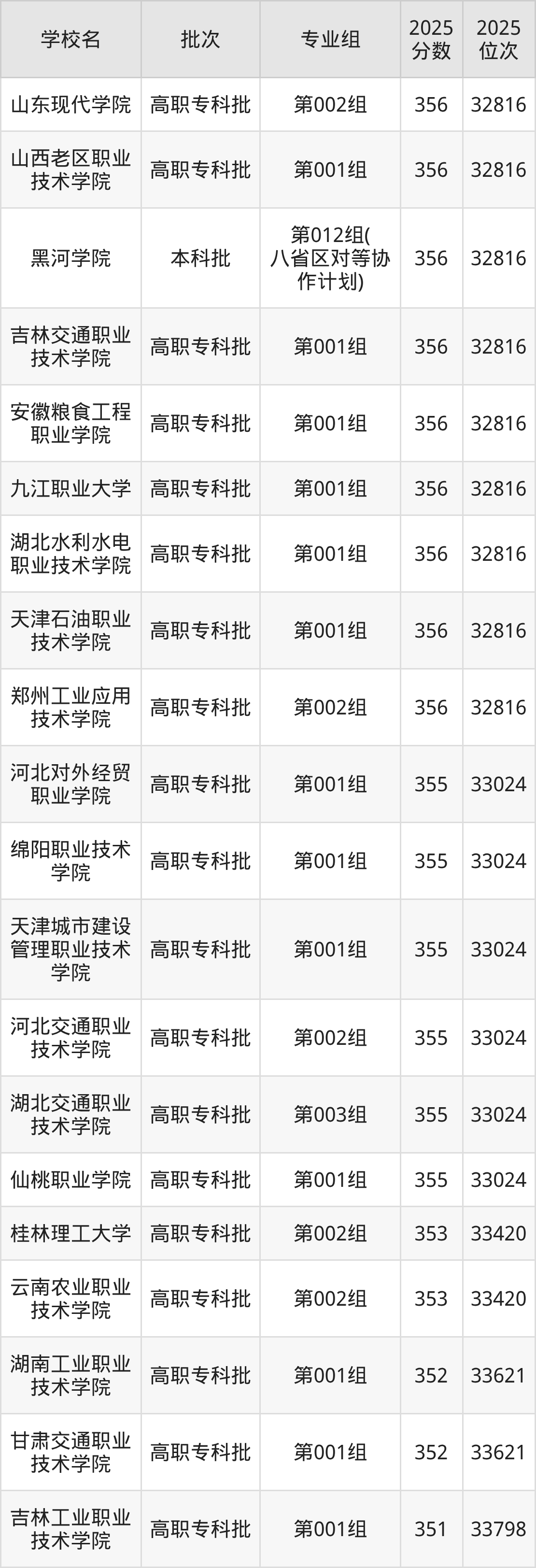 2025年黑龙江高考历史类353分(33222名~33420名)能上的大学有桂林理工大学第002组、云南农业职业技术学院第002组。