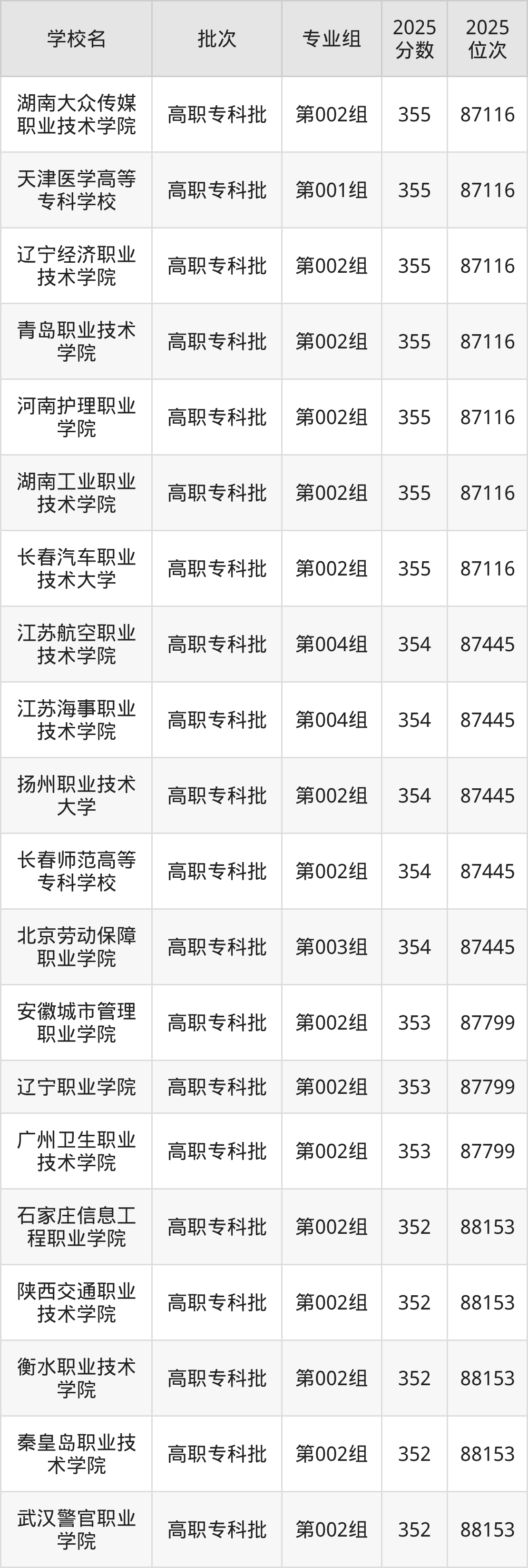 另外录取位次低于该区间(较稳妥)的有陕西交通职业技术学院第002组(88153名)、武汉警官职业学院第002组(88153名)等;录取位次高于该区间(可冲)的有北京劳动保障职业学院第003组(87445名)、长春师范高等专科学校第002组(87445名)等。