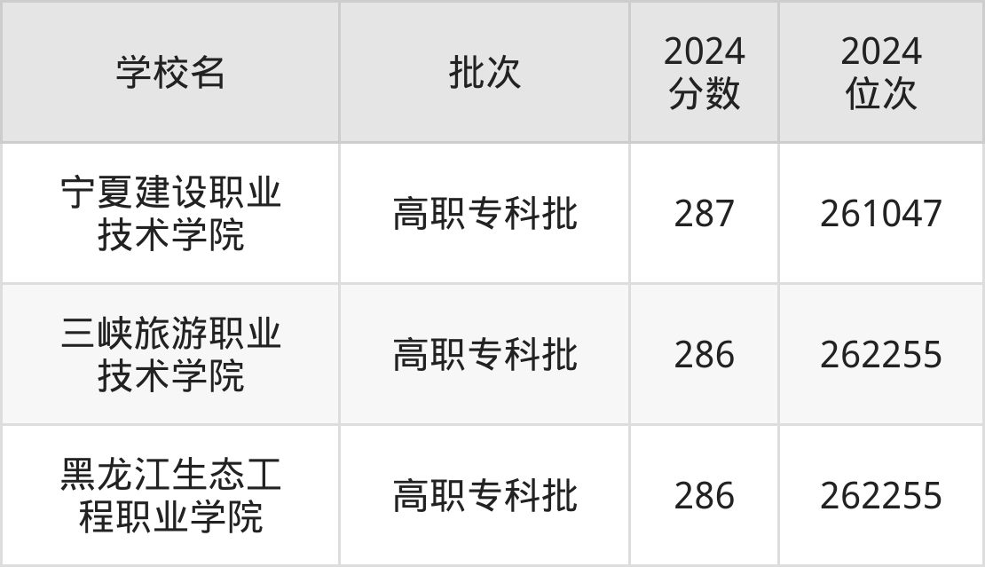 2024年河南高考文科286分(261048名~262255名)能上的大学有三峡旅游职业技术学院、黑龙江生态工程职业学院。