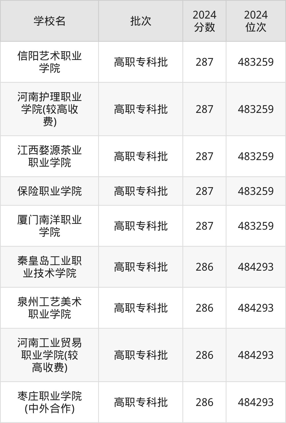 2024年河南高考理科286分(483261名~484294名)能上的大学有泉州工艺美术职业学院、枣庄职业学院(中外合作)、河南工业贸易职业学院(较高收费)、秦皇岛工业职业技术学院。