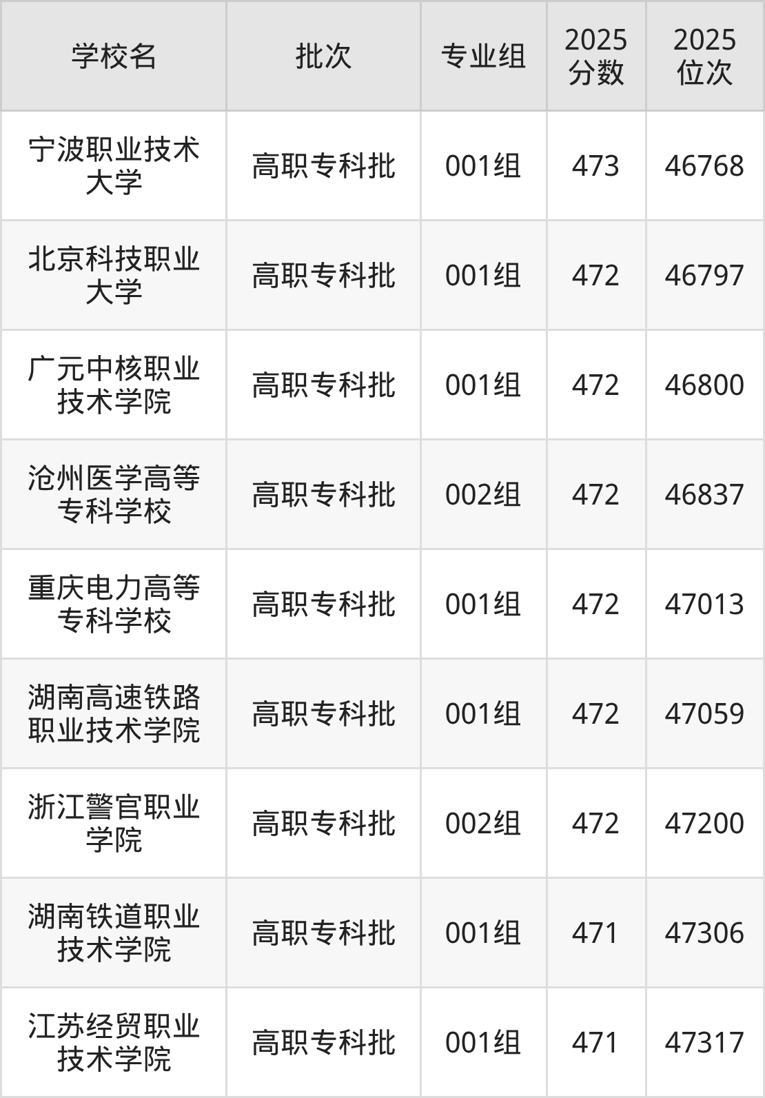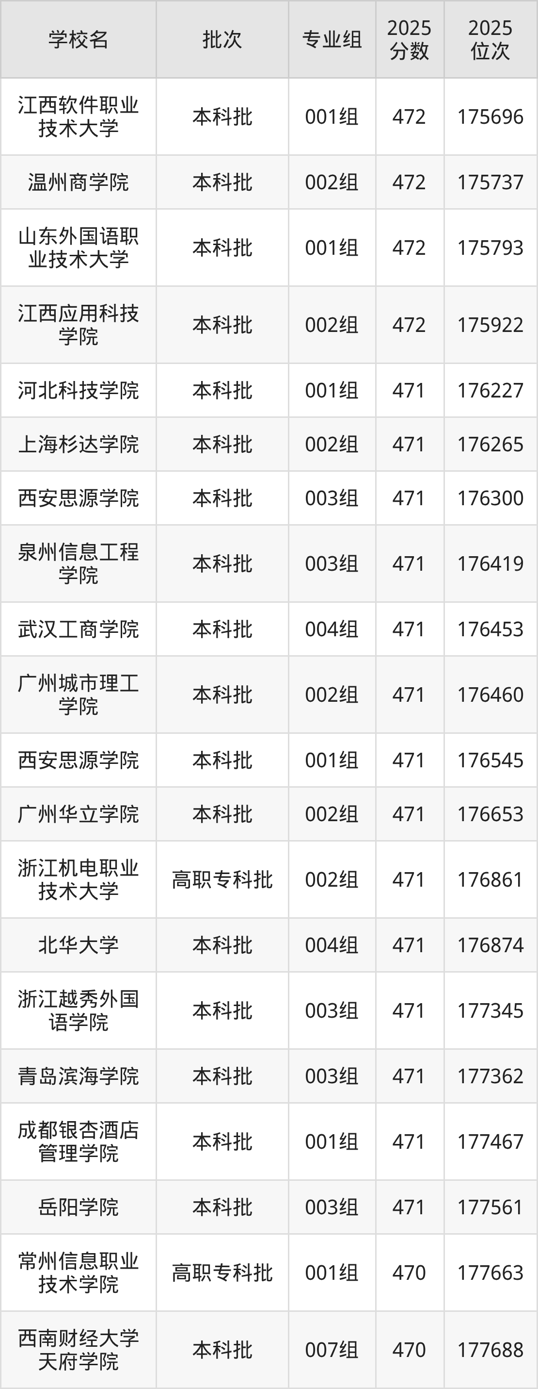 2025年安徽高考历史类471分(47266名~47775名)能上的大学有湖南铁道职业技术学院001组、江苏经贸职业技术学院001组。