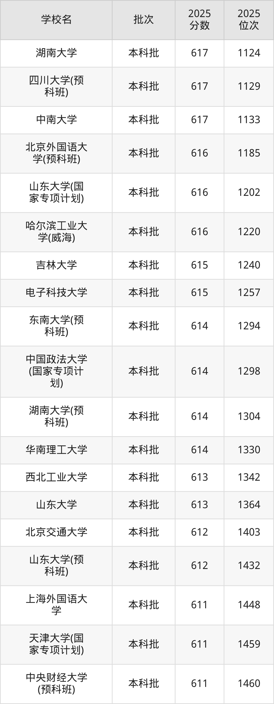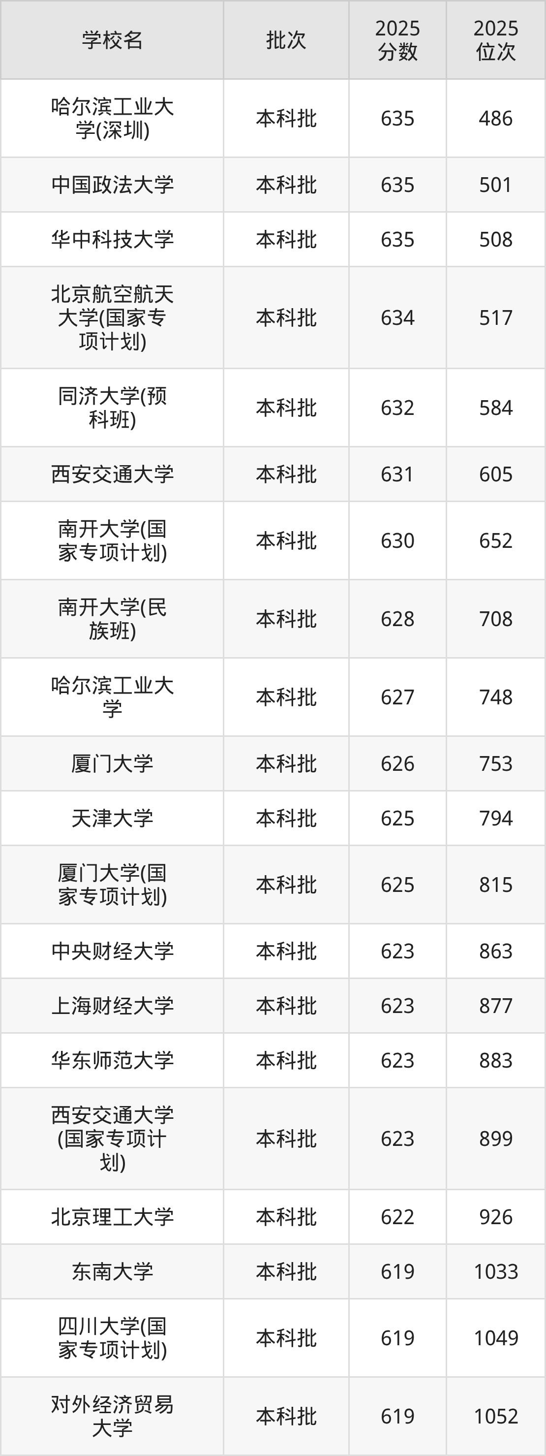 2025年贵州高考历史类620分(978名~1019名)录取位次低于该区间(较稳妥)的有东南大学(1033名)、四川大学(国家专项计划)(1049名)等;录取位次高于该区间(可冲)的有北京理工大学(926名)、西安交通大学(国家专项计划)(899名)等。