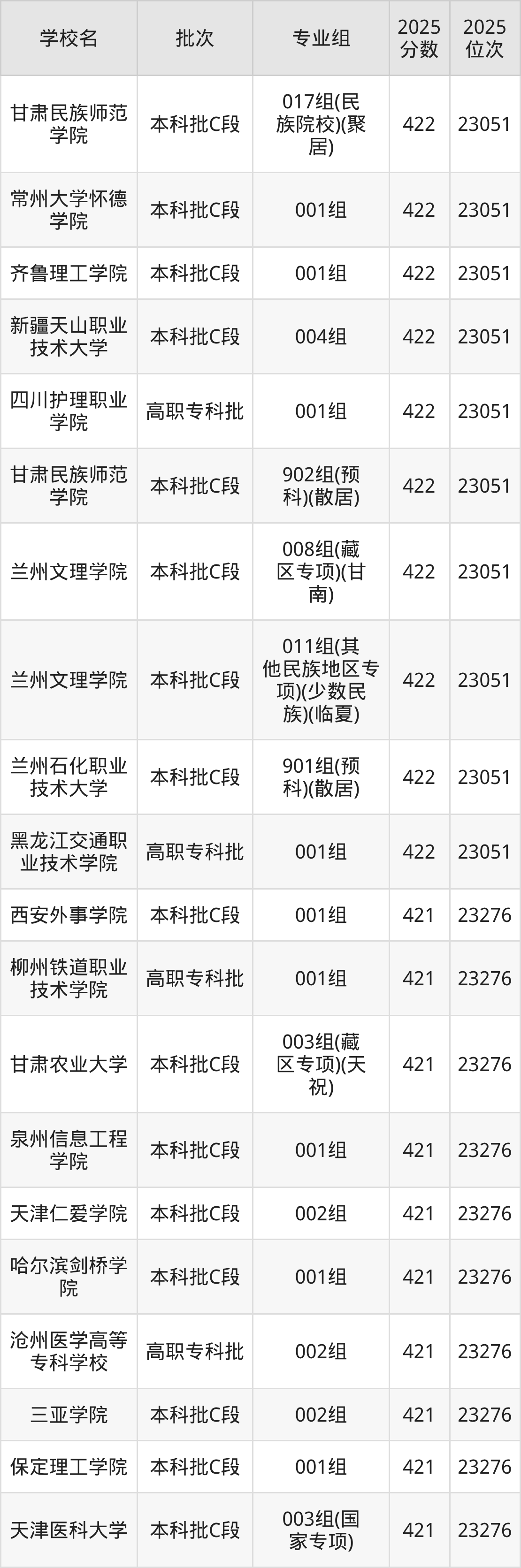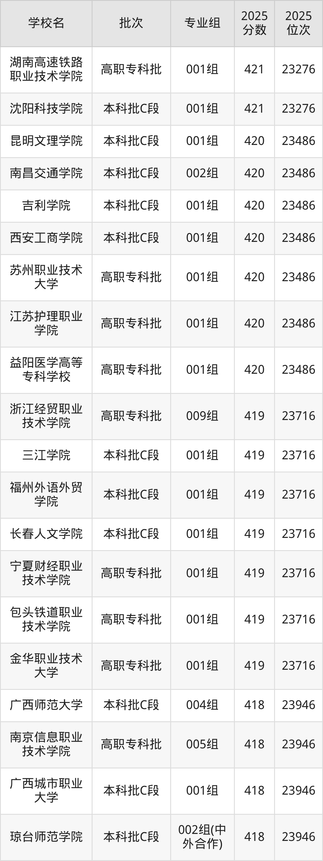 2025年甘肃高考历史类419分(23487名~23716名)能上的大学有长春人文学院001组、三江学院001组、福州外语外贸学院001组、包头铁道职业技术学院001组等。