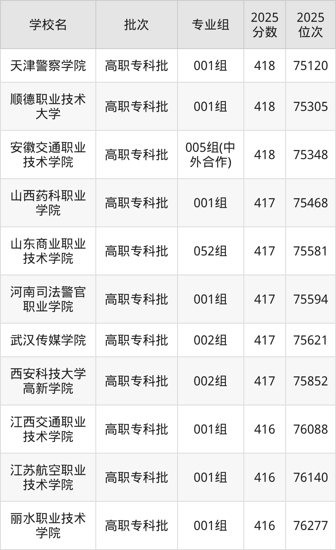 2025年安徽高考历史类417分(75388名~75905名)能上的大学有河南司法警官职业学院001组、山东商业职业技术学院052组、山西药科职业学院001组、武汉传媒学院002组等。