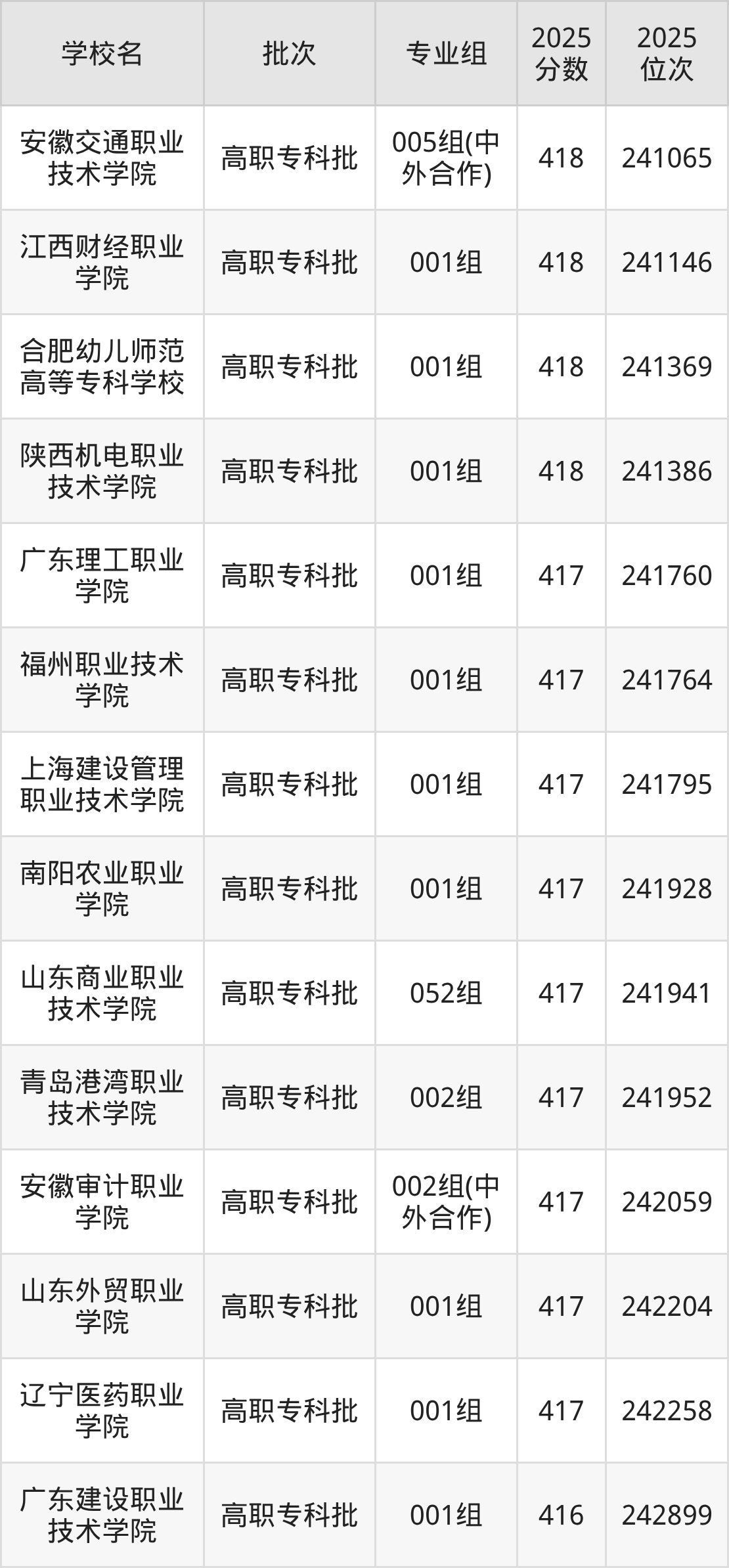 2025年安徽高考物理类417分(241467名~242450名)能上的大学有福州职业技术学院001组、广东理工职业学院001组、辽宁医药职业学院001组、南阳农业职业学院001组等。