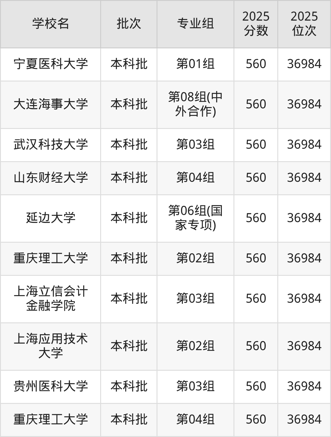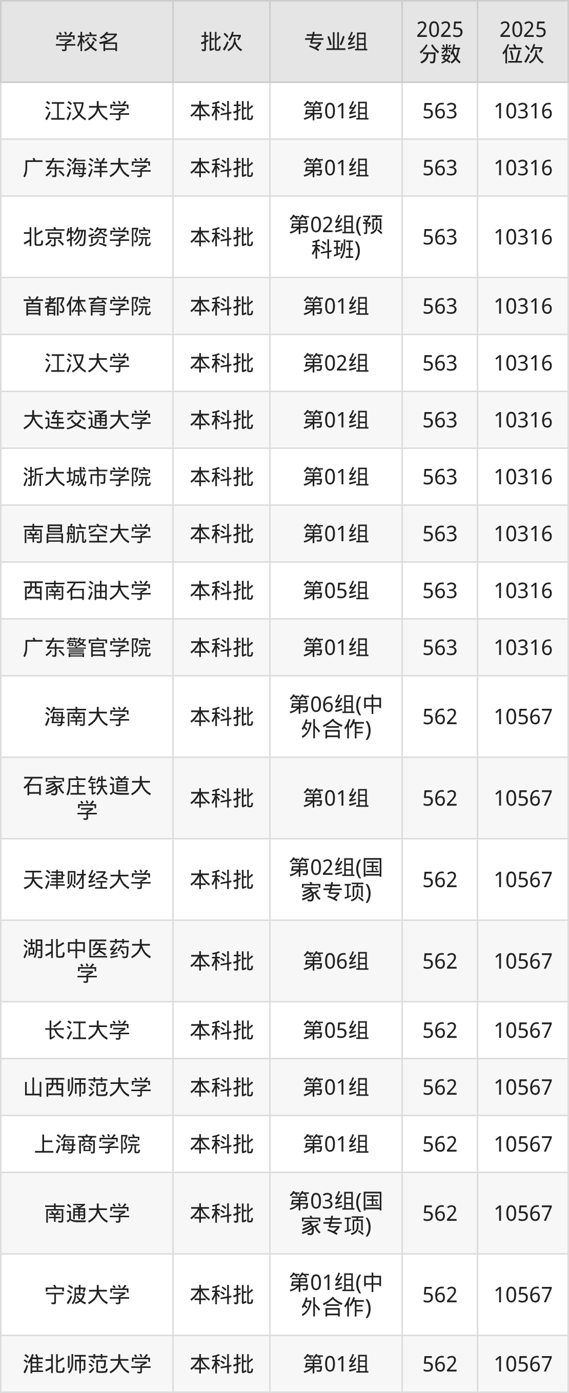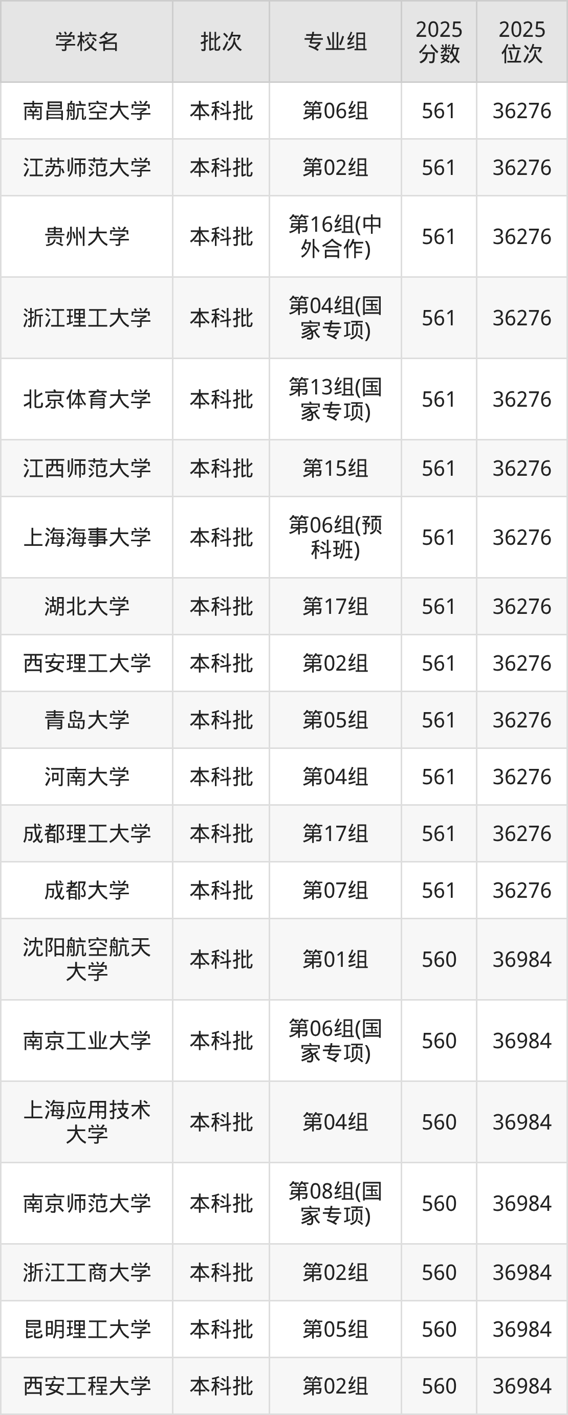 2025年湖北高考物理类560分(36277名~36984名)能上的大学有大连海事大学第08组(中外合作)、武汉科技大学第03组、沈阳航空航天大学第01组、延边大学第06组(国家专项)等。
