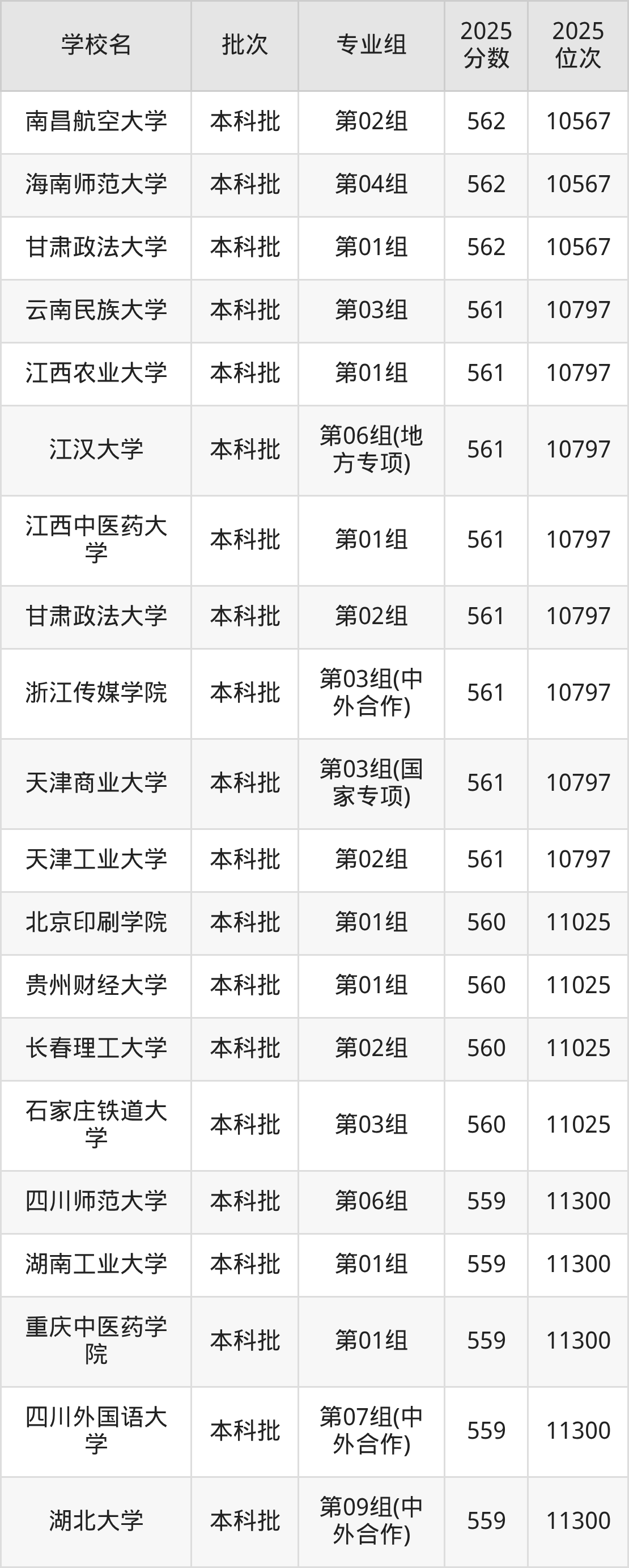 2025年湖北高考历史类560分(10798名~11025名)能上的大学有北京印刷学院第01组、石家庄铁道大学第03组、长春理工大学第02组、贵州财经大学第01组。