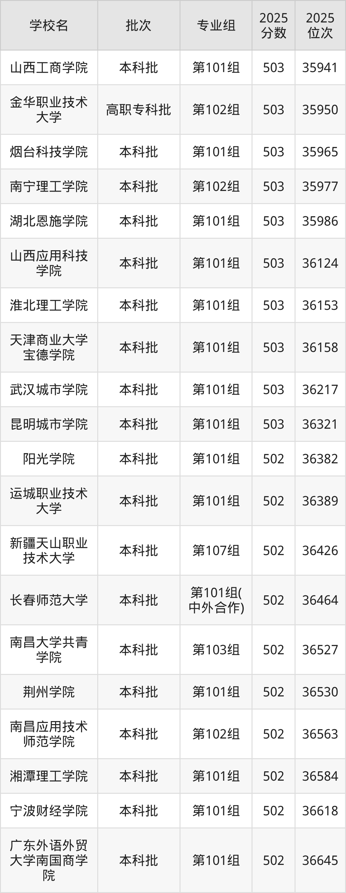2025年江西高考历史类502分(36364名~37020名)能上的大学有内蒙古大学创业学院第101组、长春师范大学第101组(中外合作)、宁波财经学院第101组、新疆天山职业技术大学第105组等。