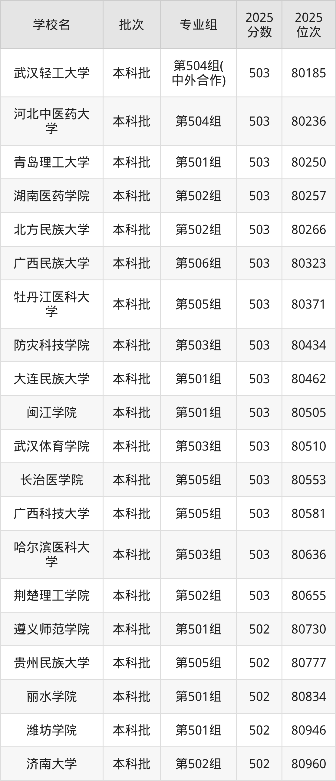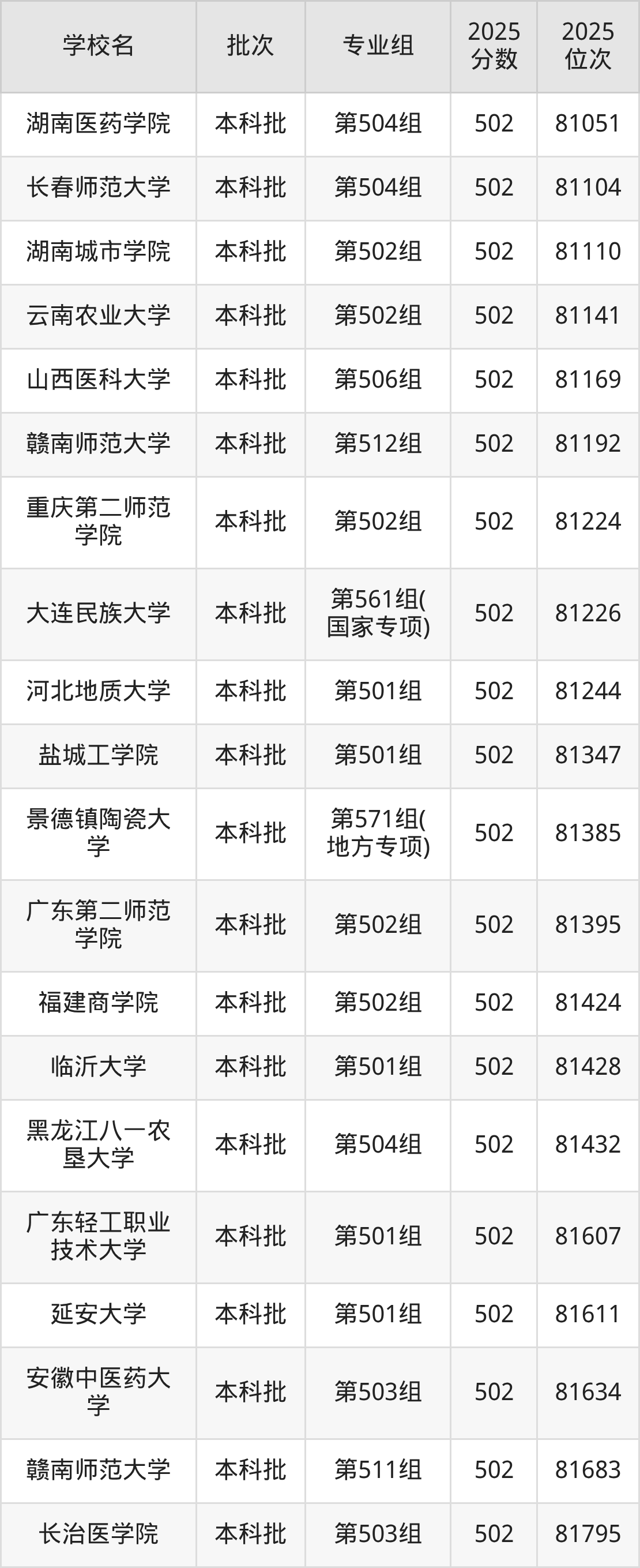 另外录取位次低于该区间(较稳妥)的有长春大学第509组(81921名)、长沙师范学院第501组(81963名)等;录取位次高于该区间(可冲)的有荆楚理工学院第502组(80655名)、哈尔滨医科大学第503组(80636名)等。