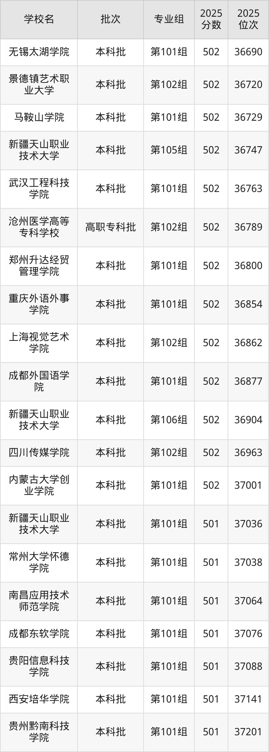 另外录取位次低于该区间(较稳妥)的有新疆天山职业技术大学第101组(37036名)、常州大学怀德学院第101组(37038名)等;录取位次高于该区间(可冲)的有昆明城市学院第101组(36321名)、武汉城市学院第101组(36217名)等。