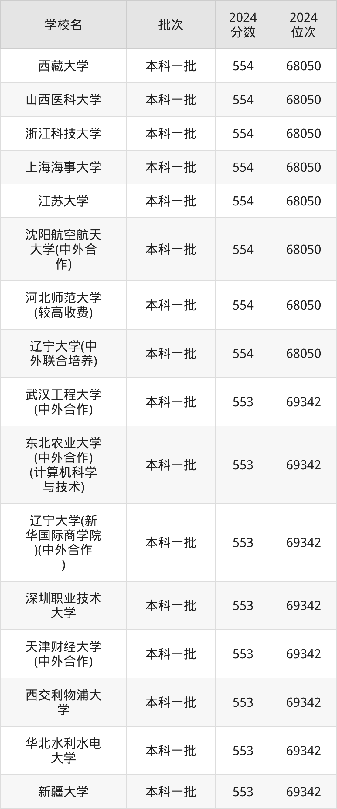 2024年河南高考理科553分(68051名~69342名)能上的大学有西交利物浦大学、华北水利水电大学、新疆大学、深圳职业技术大学等。