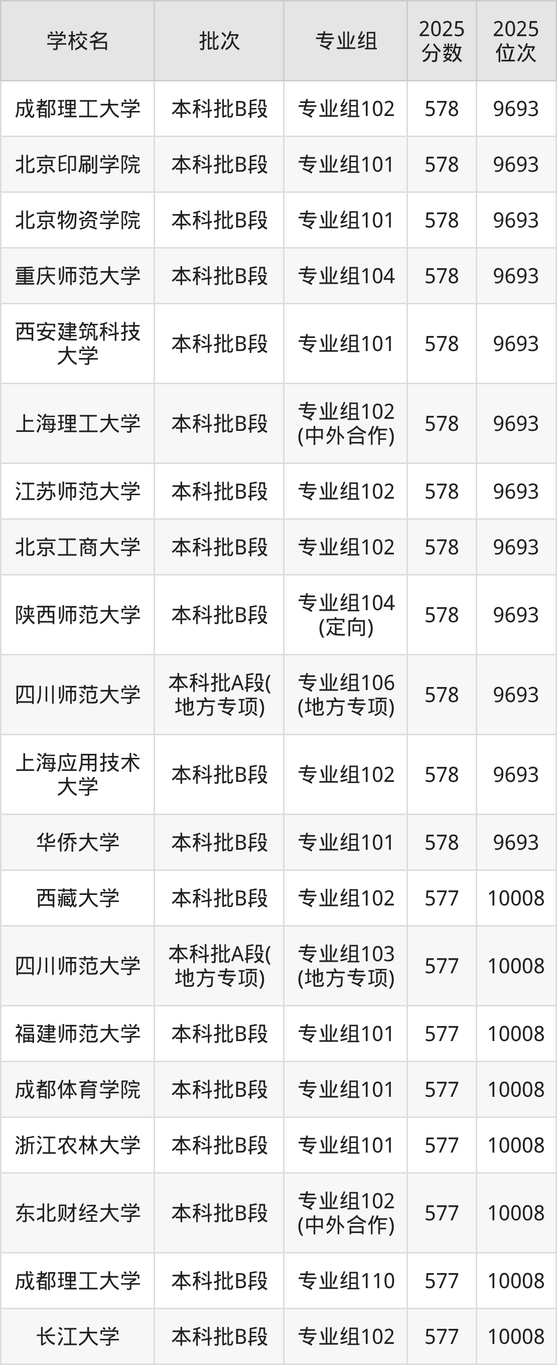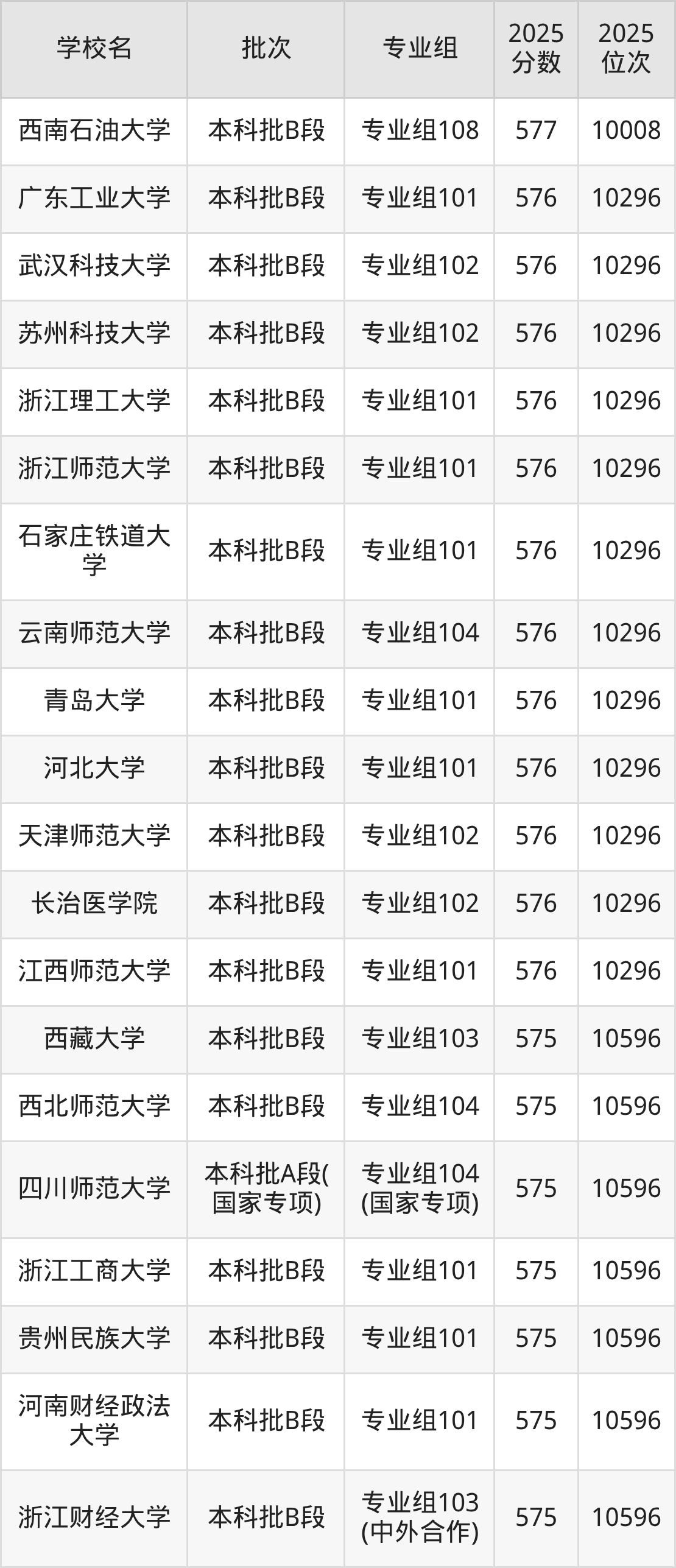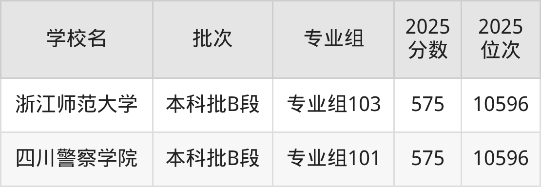 另外录取位次低于该区间(较稳妥)的有浙江师范大学专业组103(10596名)、贵州民族大学专业组101(10596名)等;录取位次高于该区间(可冲)的有成都体育学院专业组101(10008名)、西南石油大学专业组108(10008名)等。