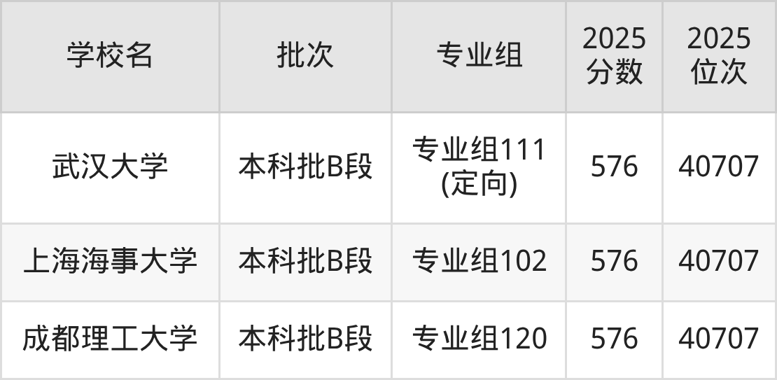 2025年四川高考物理类576分(39824名~40707名)能上的大学有湖北工业大学专业组102、上海海事大学专业组102、武汉大学专业组111(定向)、南昌航空大学专业组103等。