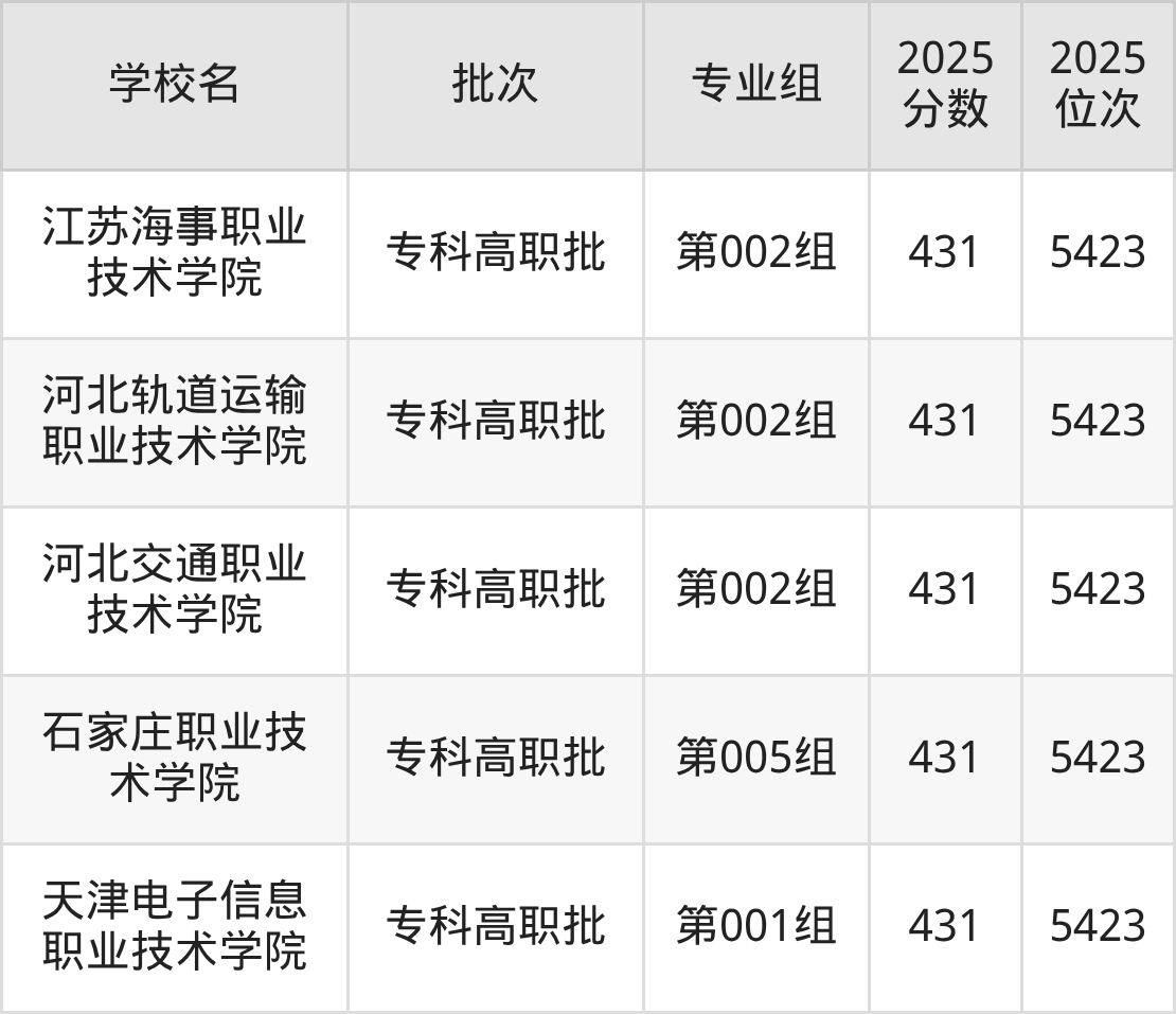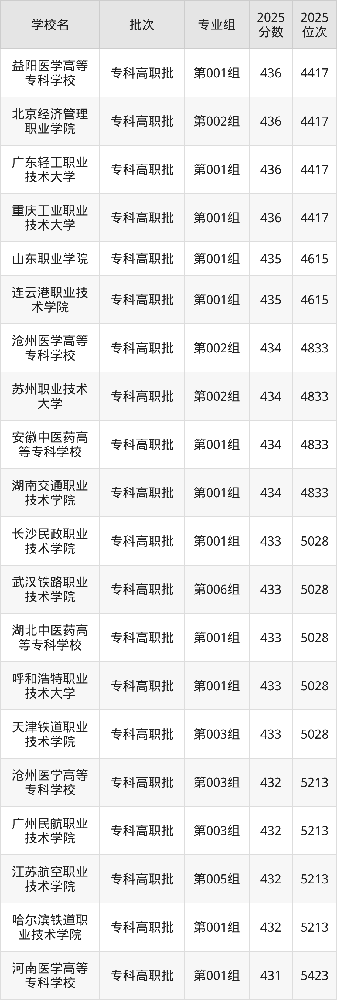 2025年山西高考历史类433分(4834名~5028名)能上的大学有天津铁道职业技术学院第003组、呼和浩特职业技术大学第001组、湖北中医药高等专科学校第001组、武汉铁路职业技术学院第006组等。