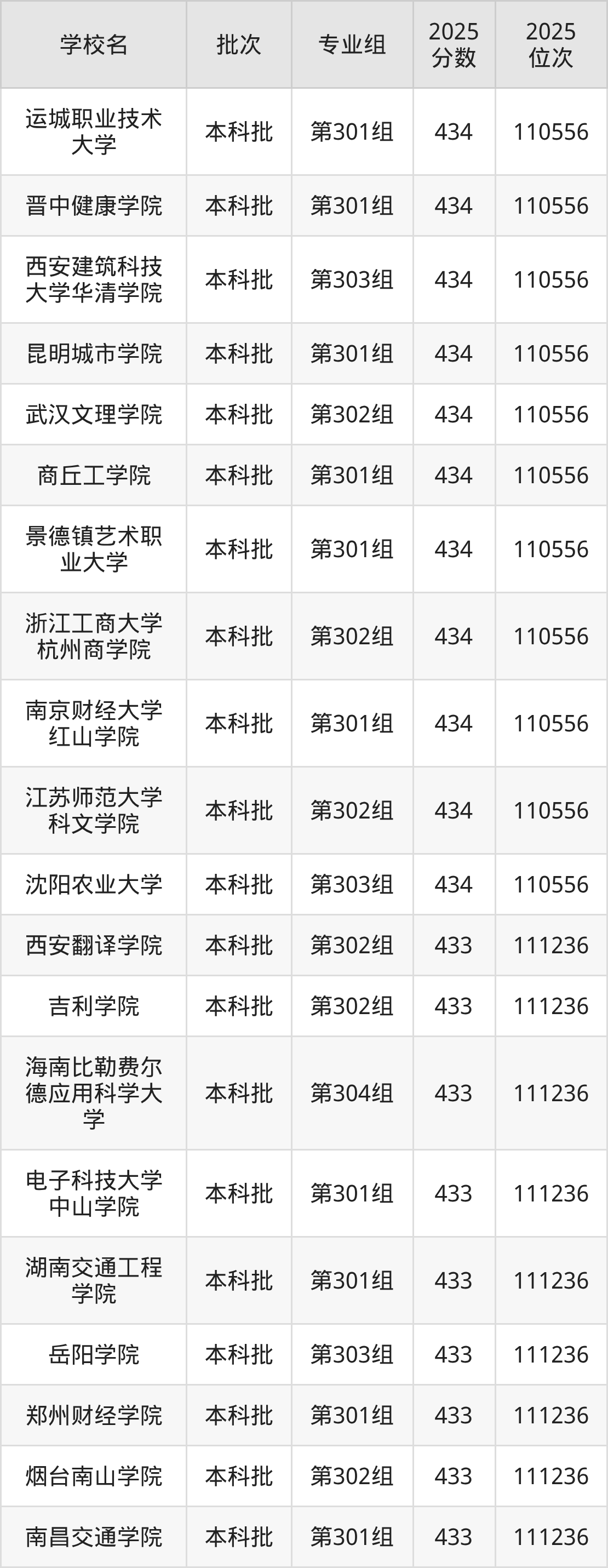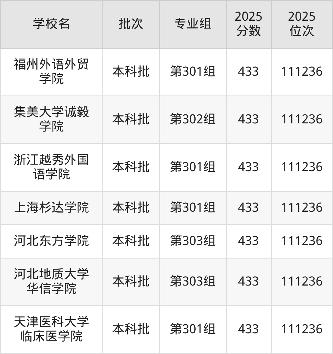 2025年山西高考物理类433分(110557名~111236名)能上的大学有天津医科大学临床医学院第301组、河北地质大学华信学院第303组、河北东方学院第303组、上海杉达学院第301组等。
