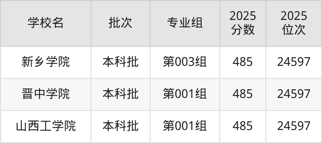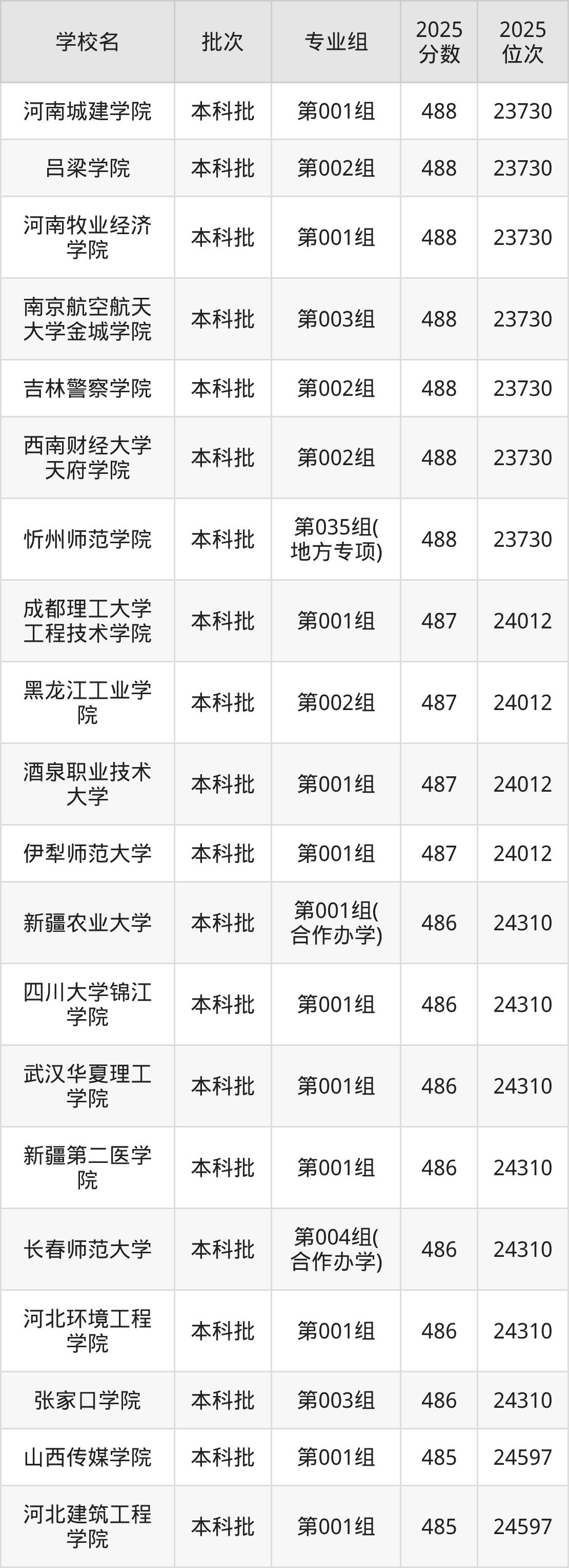 2025年山西高考历史类486分(24013名~24310名)能上的大学有张家口学院第003组、河北环境工程学院第001组、长春师范大学第004组(合作办学)、武汉华夏理工学院第001组等。