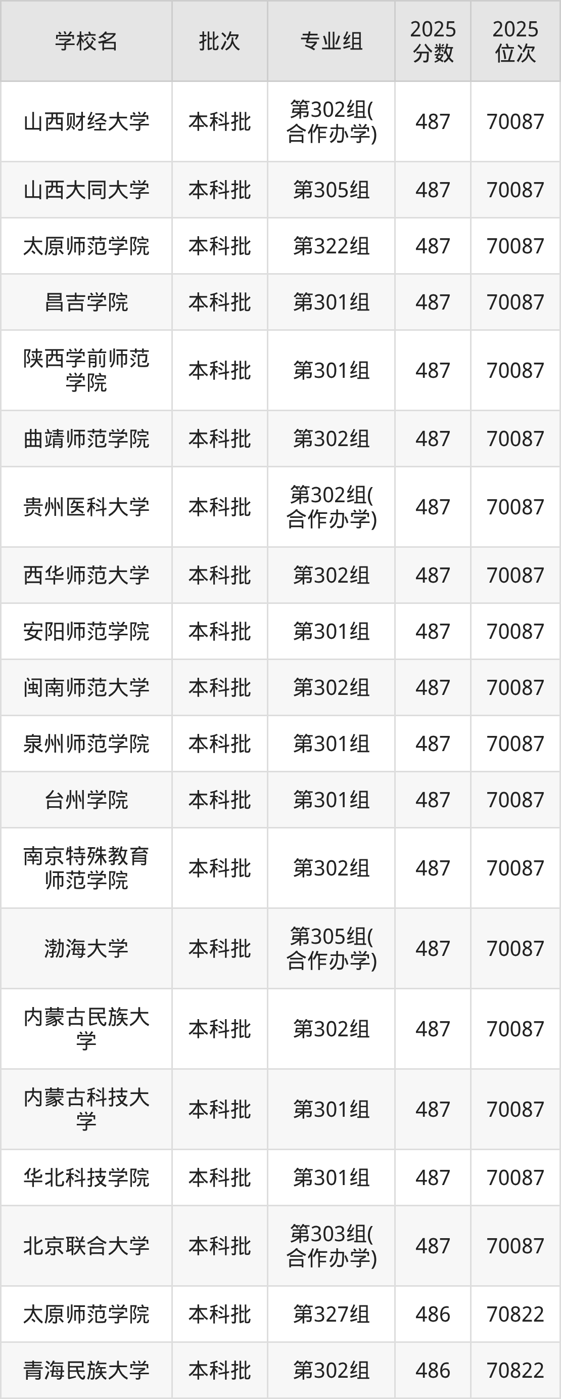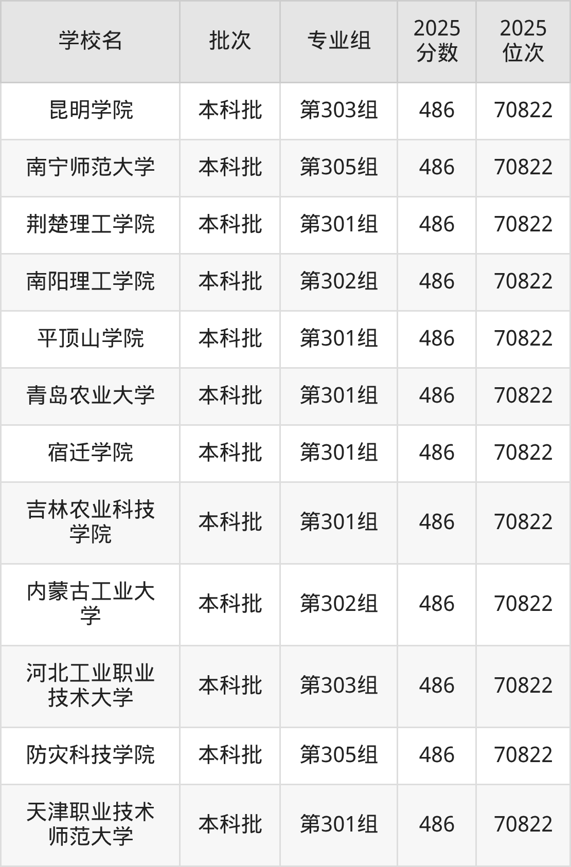 2025年山西高考物理类486分(70088名~70822名)能上的大学有天津职业技术师范大学第301组、防灾科技学院第305组、河北工业职业技术大学第303组、内蒙古工业大学第302组等。