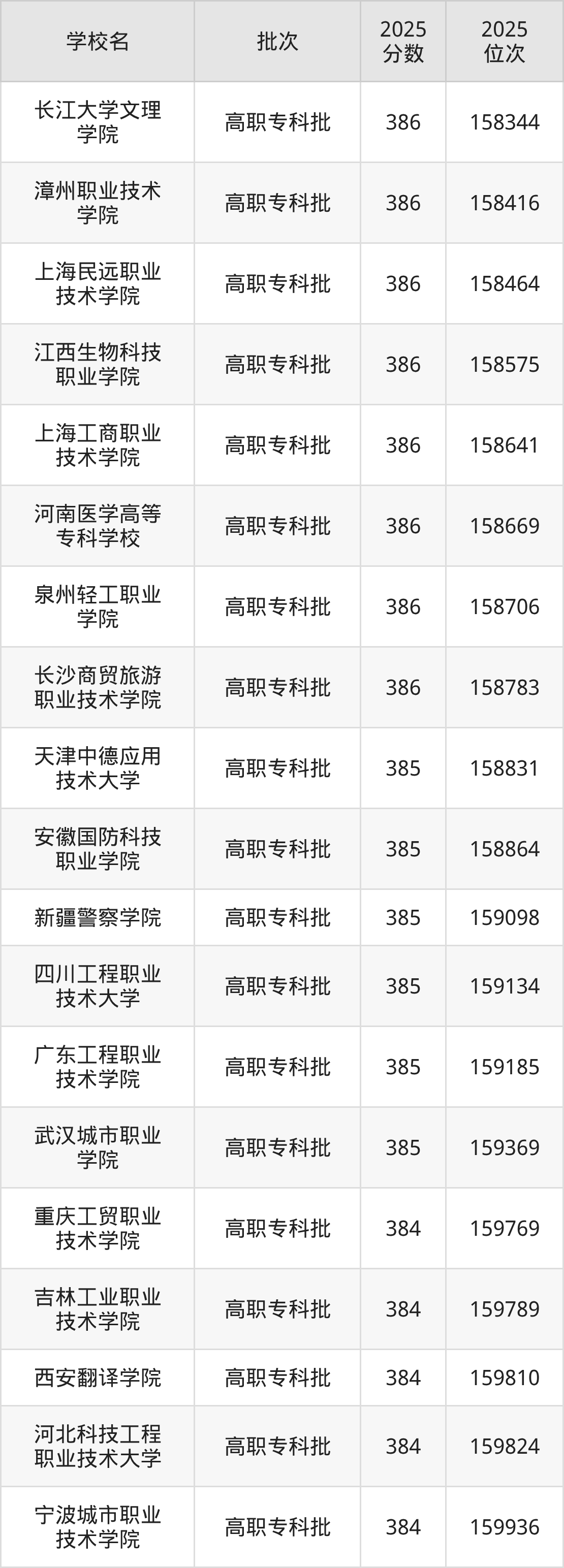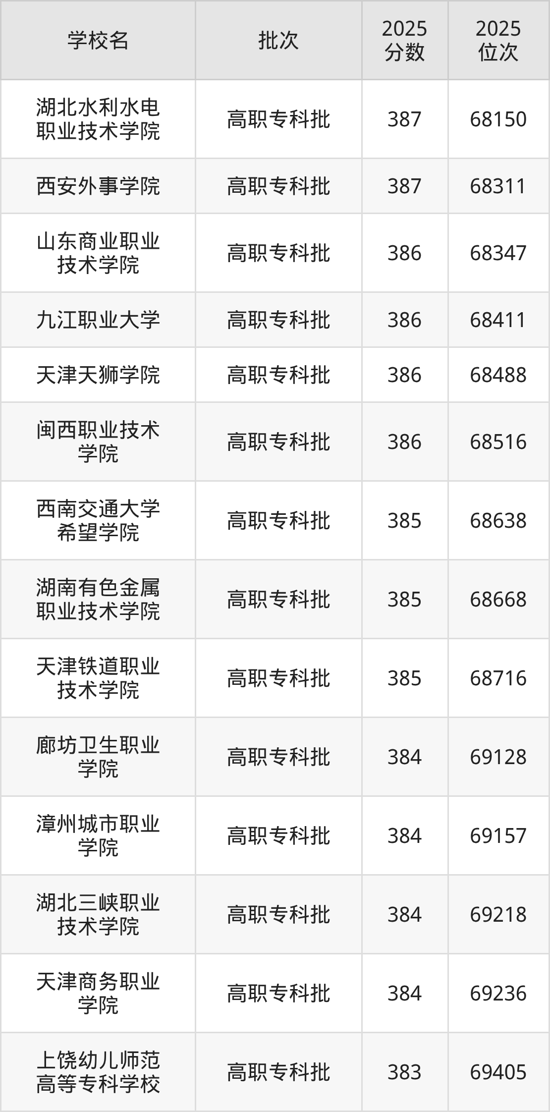 2025年贵州高考历史类385分(68634名~68994名)能上的大学有湖南有色金属职业技术学院、天津铁道职业技术学院、西南交通大学希望学院。