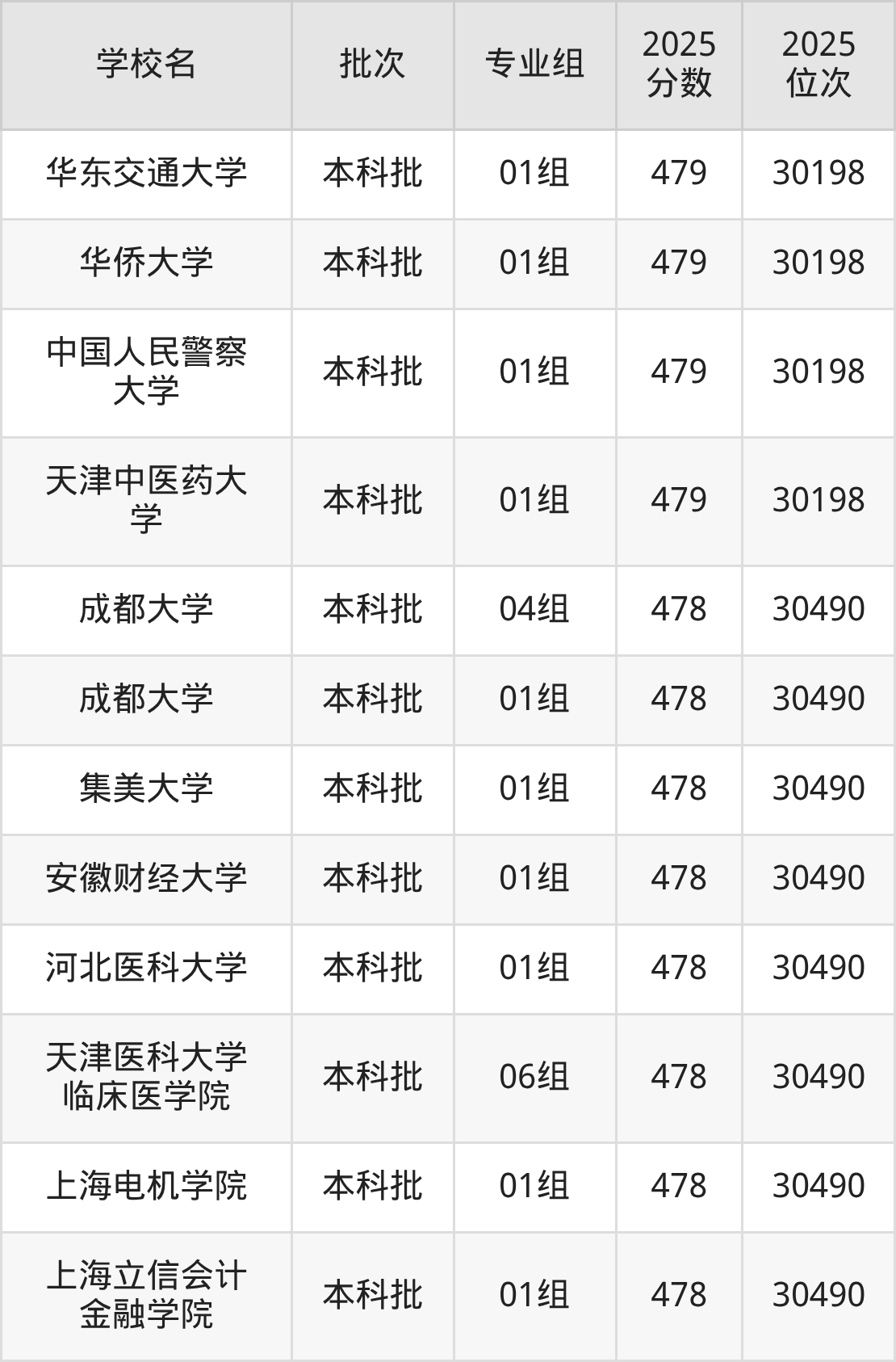 2025年上海高考479分(29908名~30198名)能上的大学有天津中医药大学01组、中国人民警察大学01组、华侨大学01组、华东交通大学01组等。