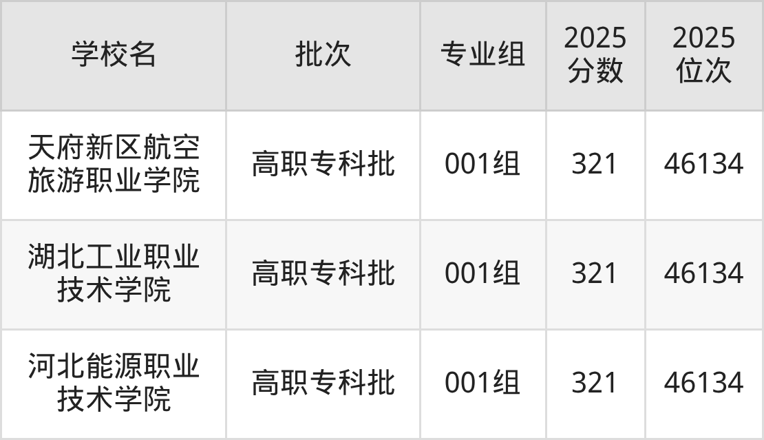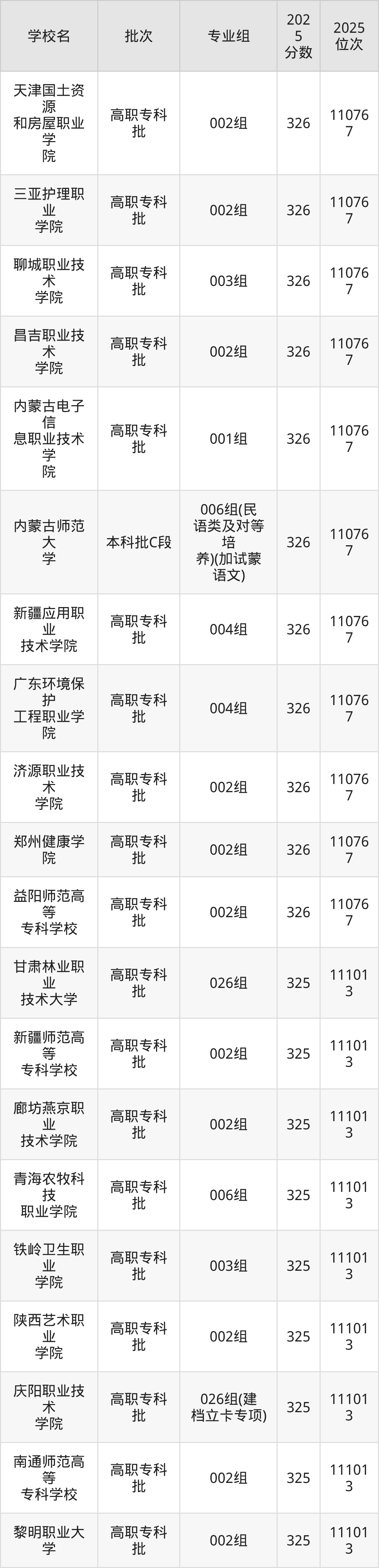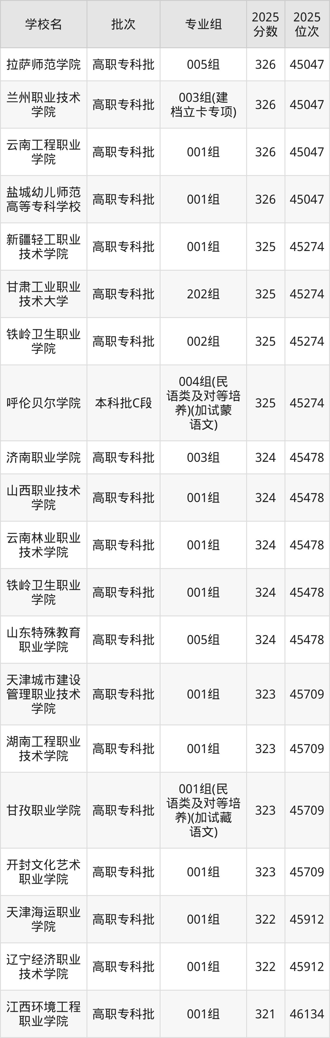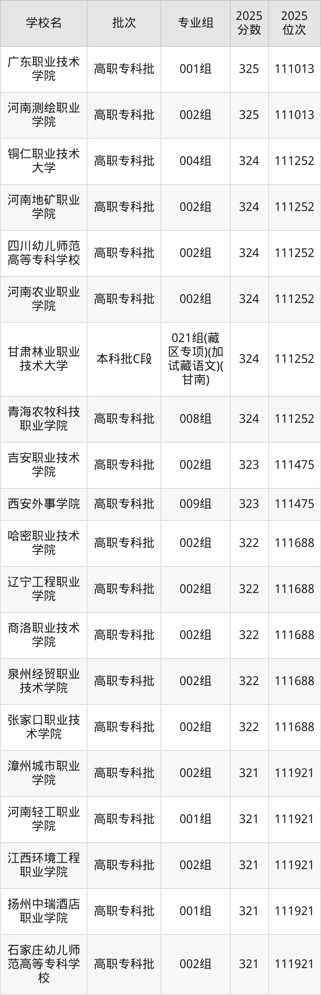 2025年甘肃高考历史类323分(45479名~45709名)能上的大学有天津城市建设管理职业技术学院001组、开封文化艺术职业学院001组、湖南工程职业技术学院001组、甘孜职业学院001组(民语类及对等培养)(加试藏语文)。