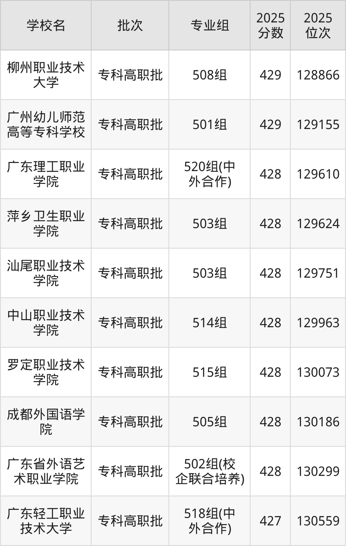 2025年广东高考历史类428分(129252名~130331名)能上的大学有汕尾职业技术学院503组、罗定职业技术学院515组、广东省外语艺术职业学院502组(校企联合培养)、成都外国语学院505组等。