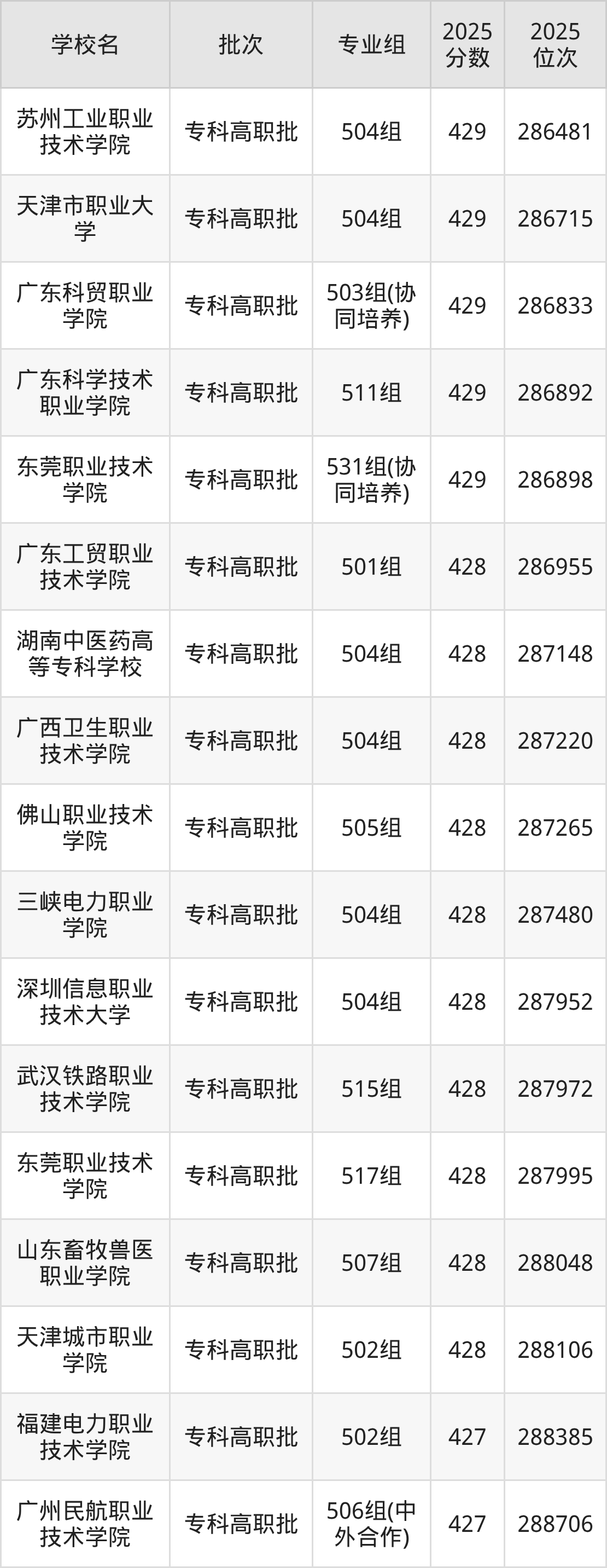另外录取位次低于该区间(较稳妥)的有福建电力职业技术学院502组(288385名)、广州民航职业技术学院506组(中外合作)(288706名)等;录取位次高于该区间(可冲)的有东莞职业技术学院531组(协同培养)(286898名)、广东科学技术职业学院511组(286892名)等。