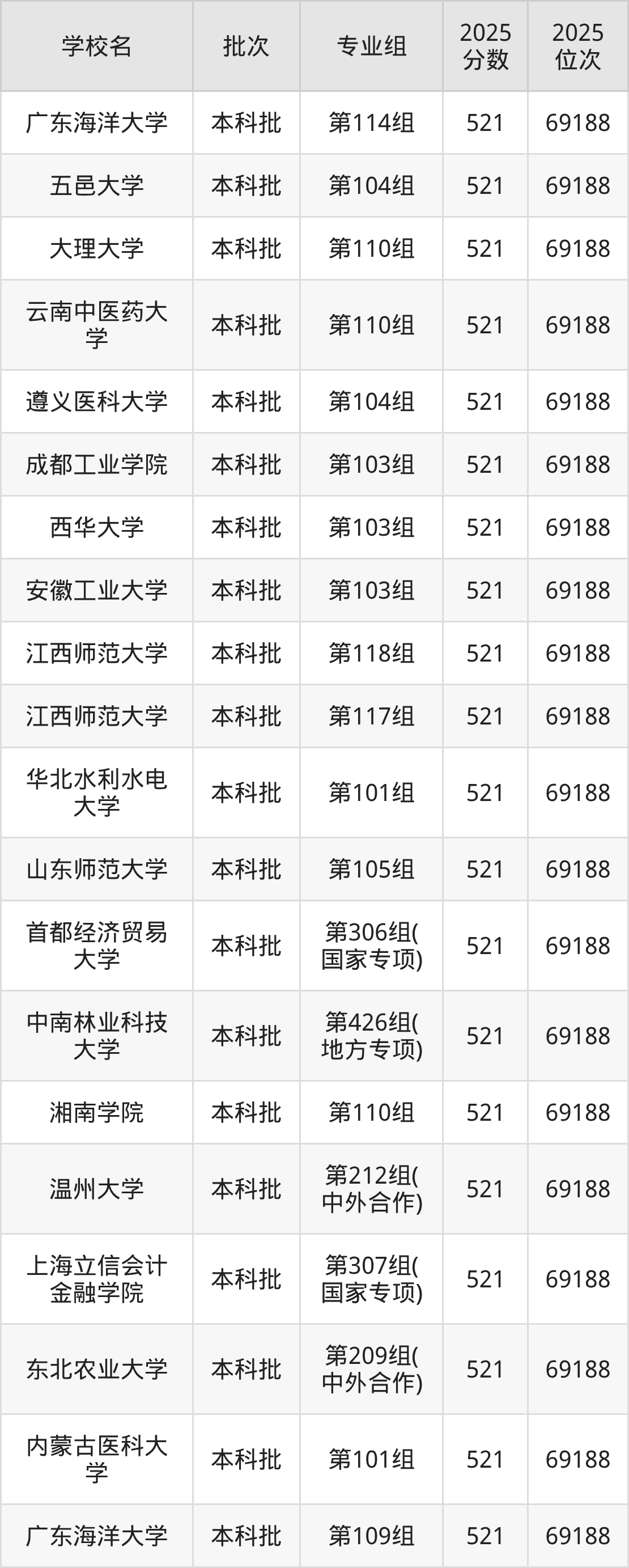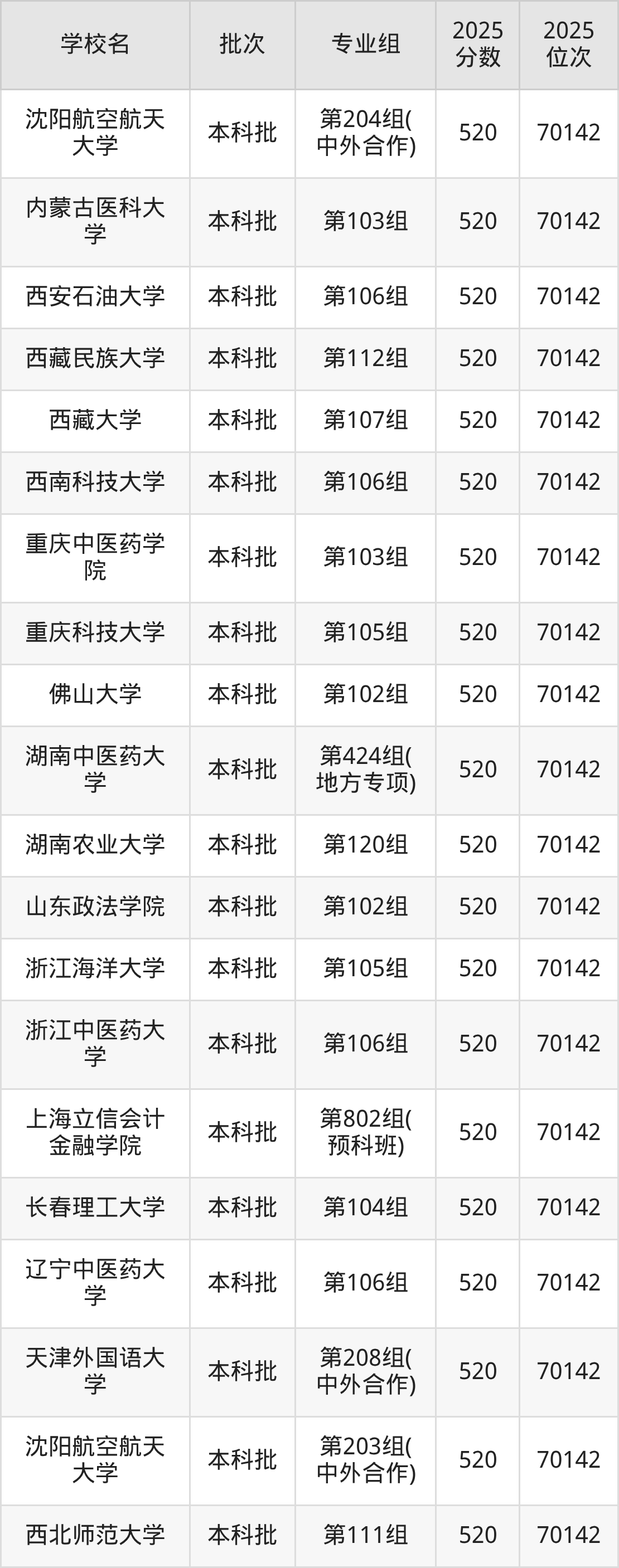 这些都是2026年高考物理类69189名~70142名考生可以报考的大学,更多学校名单如下表所示: