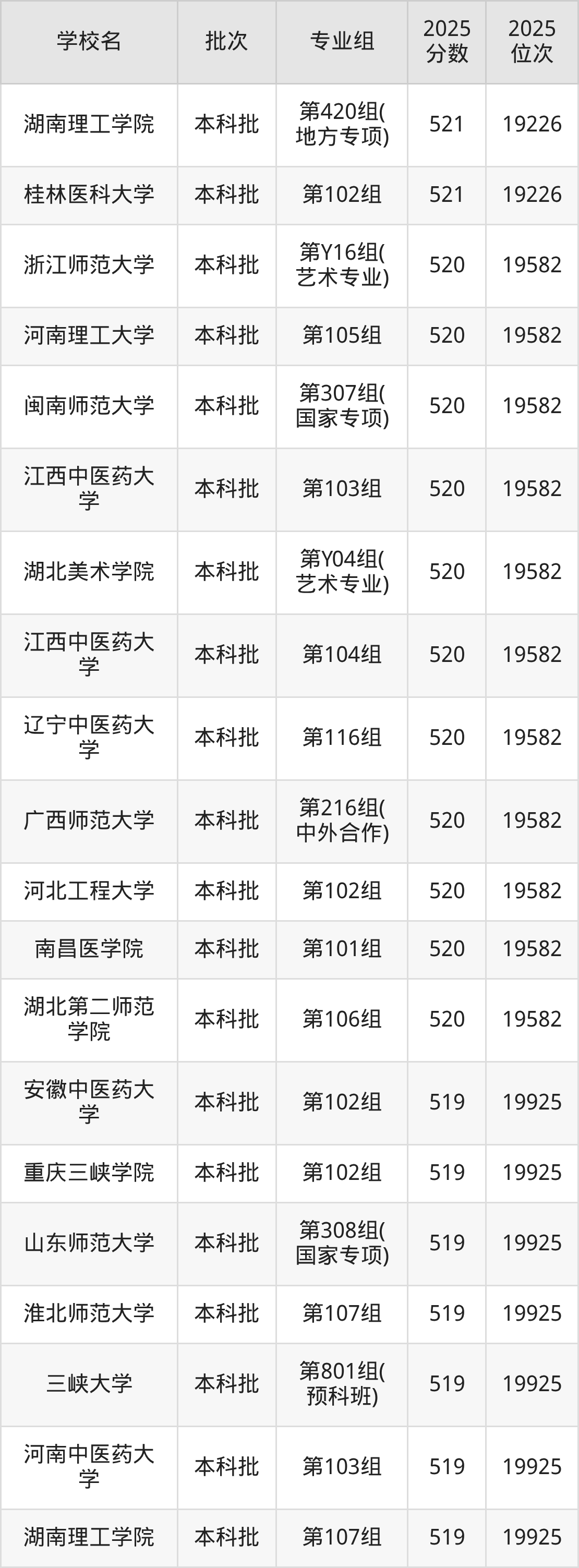 2025年湖南高考历史类520分(19227名~19582名)能上的大学有河北工程大学第102组、辽宁中医药大学第116组、闽南师范大学第307组(国家专项)、江西中医药大学第103组等。