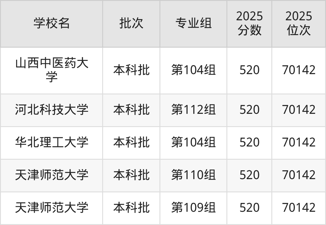 2025年湖南高考物理类520分(69189名~70142名)能上的大学有天津外国语大学第208组(中外合作)、天津师范大学第109组、天津师范大学第110组、华北理工大学第104组等。