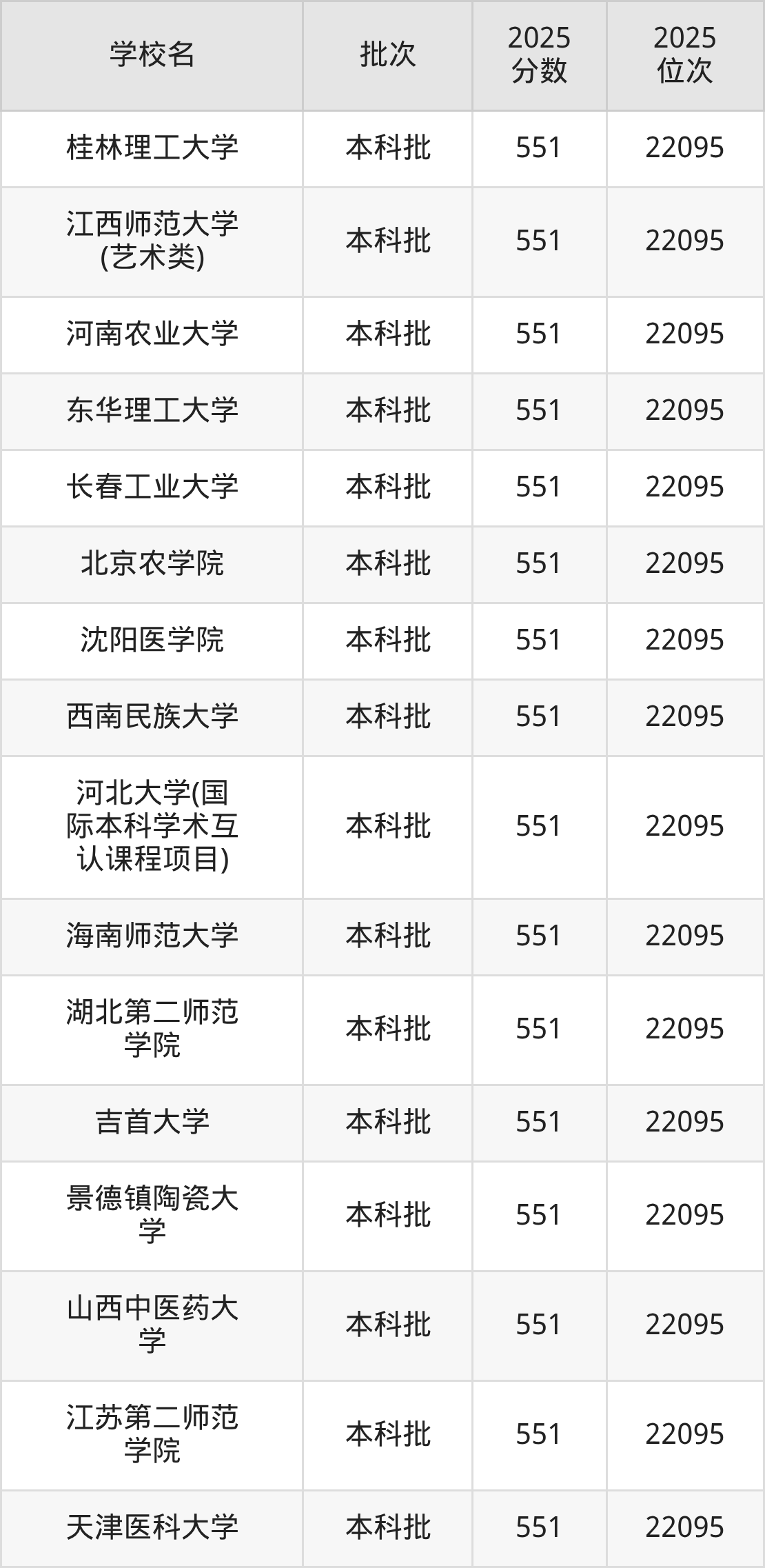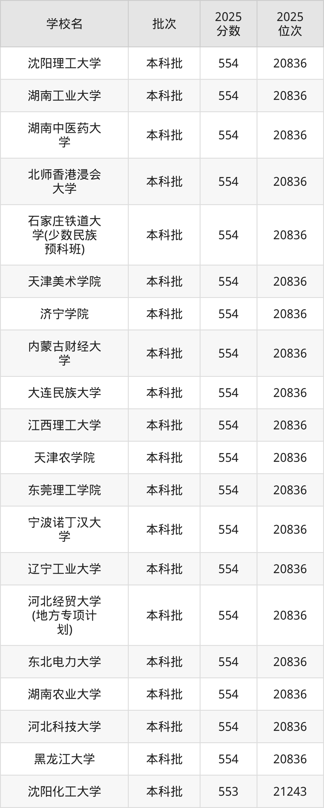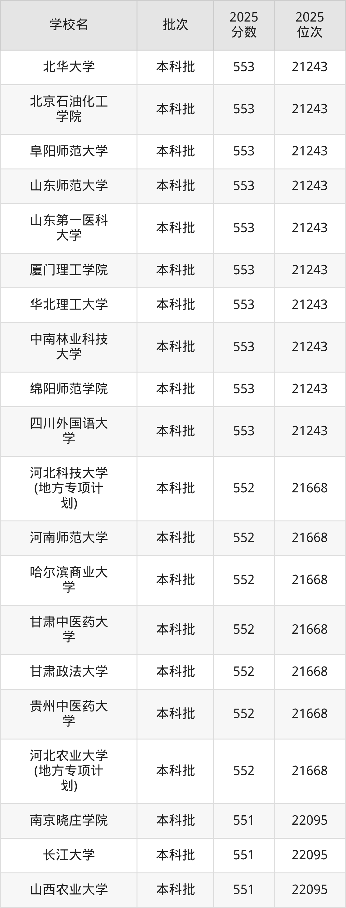 2025年河北高考历史类552分(21244名~21668名)能上的大学有河北科技大学(地方专项计划)、哈尔滨商业大学、甘肃中医药大学、甘肃政法大学等。