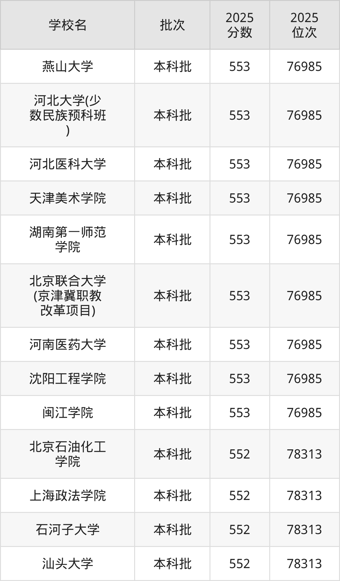 2025年河北高考物理类552分(76986名~78313名)能上的大学有上海政法学院、石河子大学、汕头大学、北京石油化工学院。
