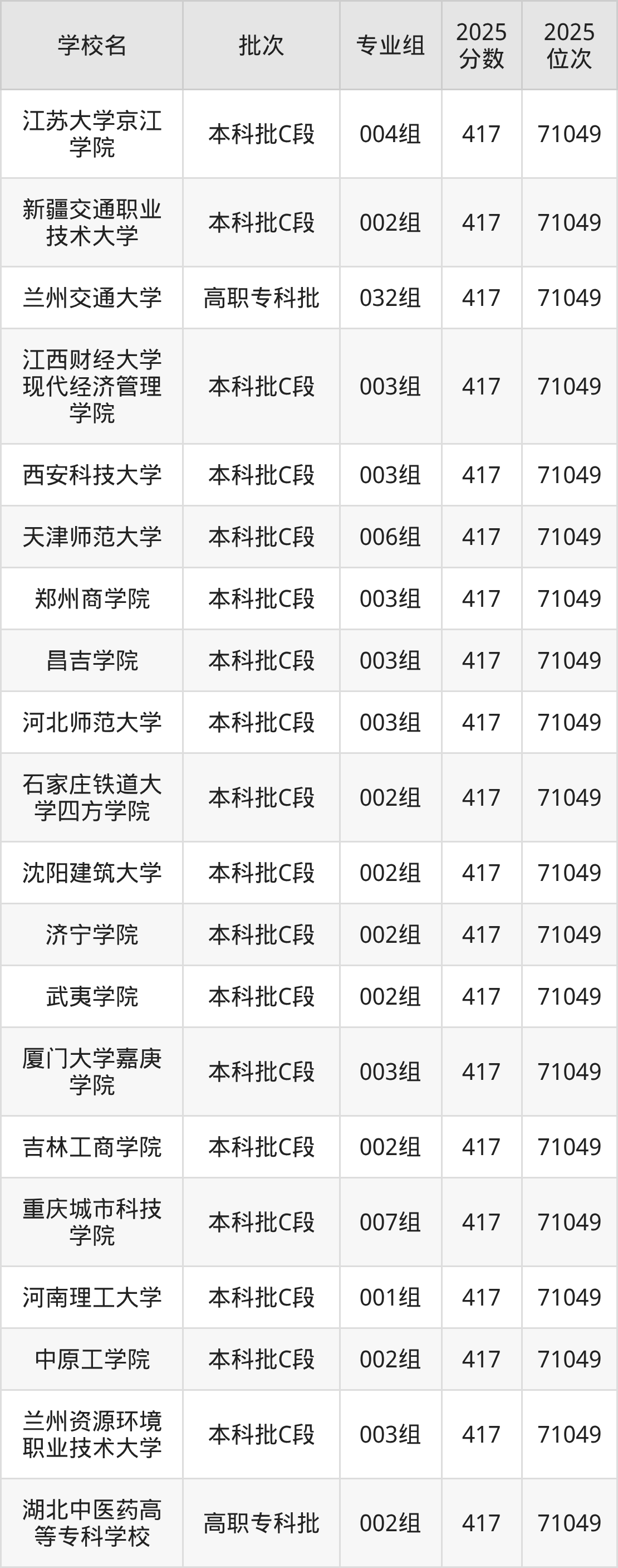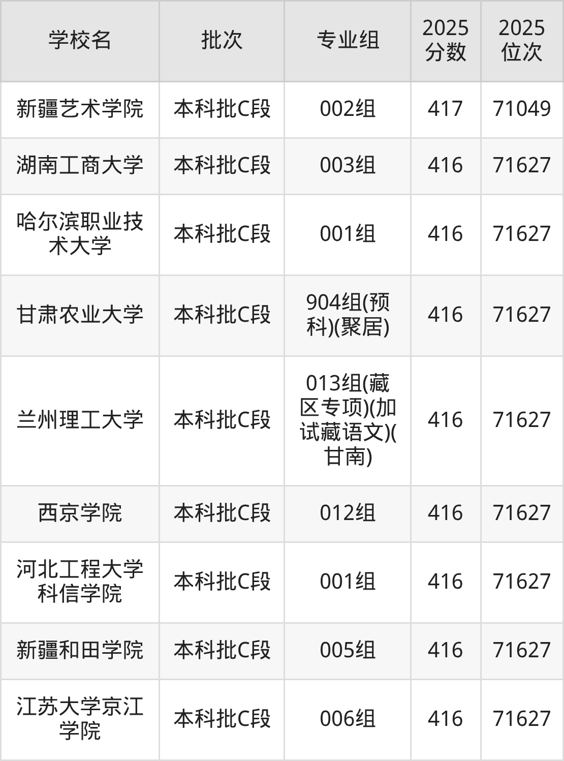 2025年甘肃高考物理类416分(71050名~71627名)能上的大学有河北工程大学科信学院001组、哈尔滨职业技术大学001组、江苏大学京江学院006组、湖南工商大学003组等。