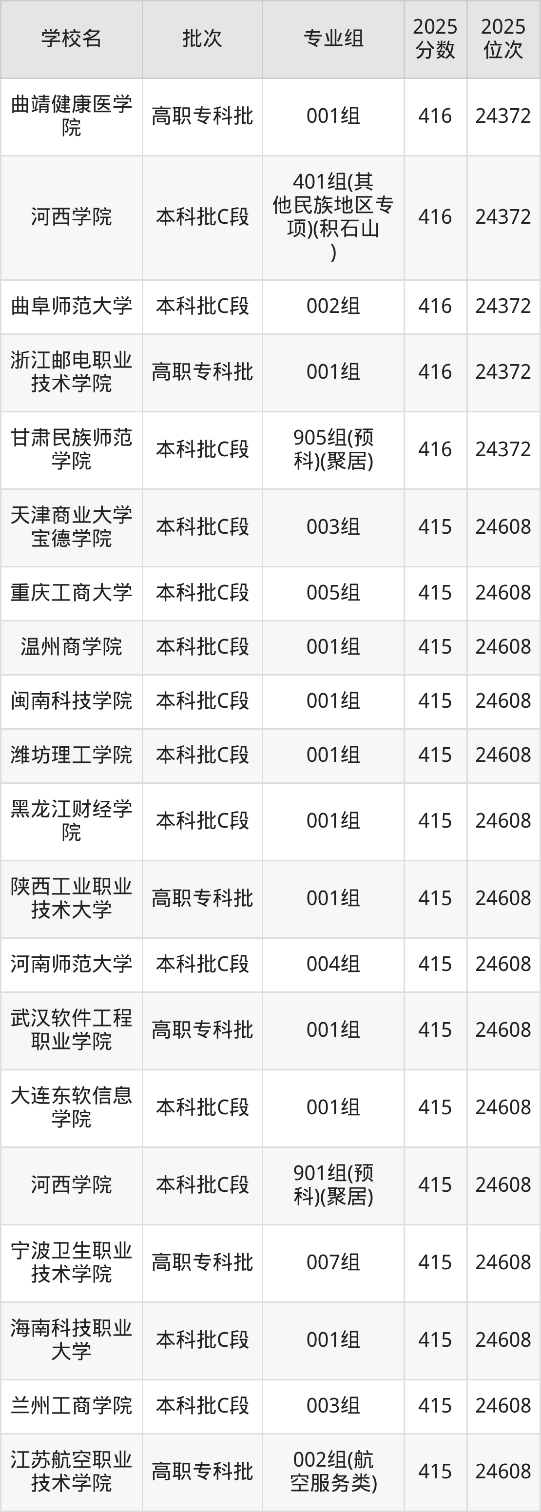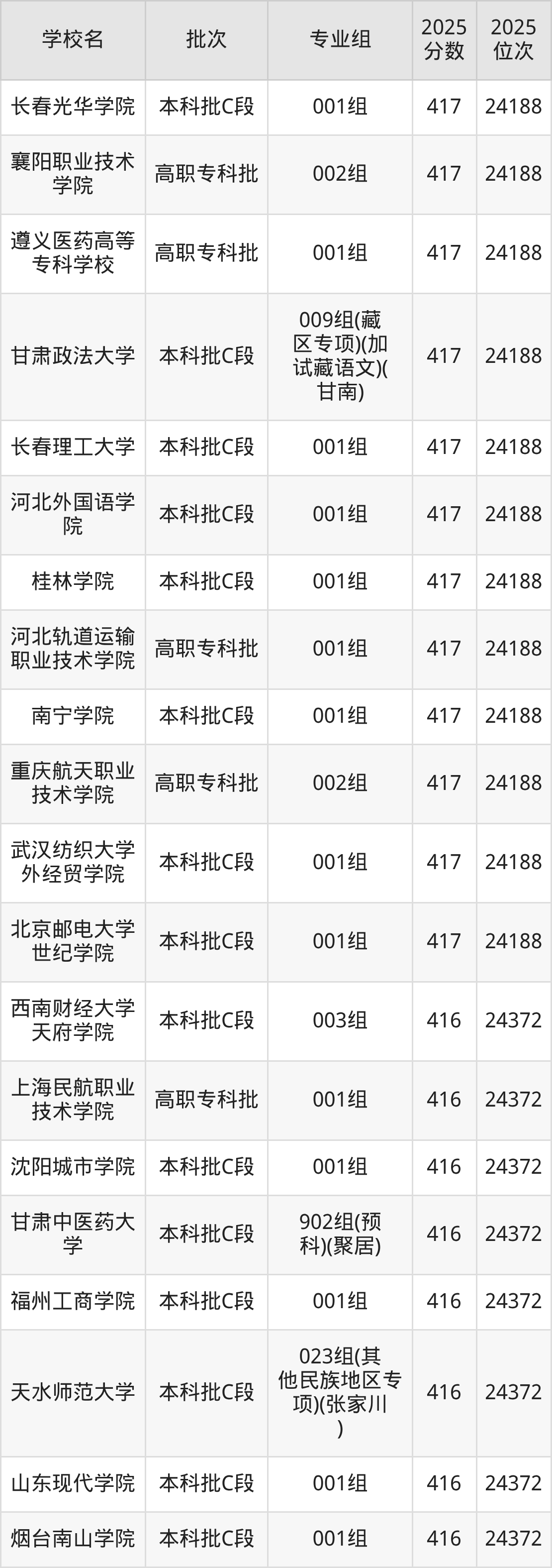 2025年甘肃高考历史类416分(24189名~24372名)能上的大学有沈阳城市学院001组、福州工商学院001组、曲阜师范大学002组、烟台南山学院001组等。