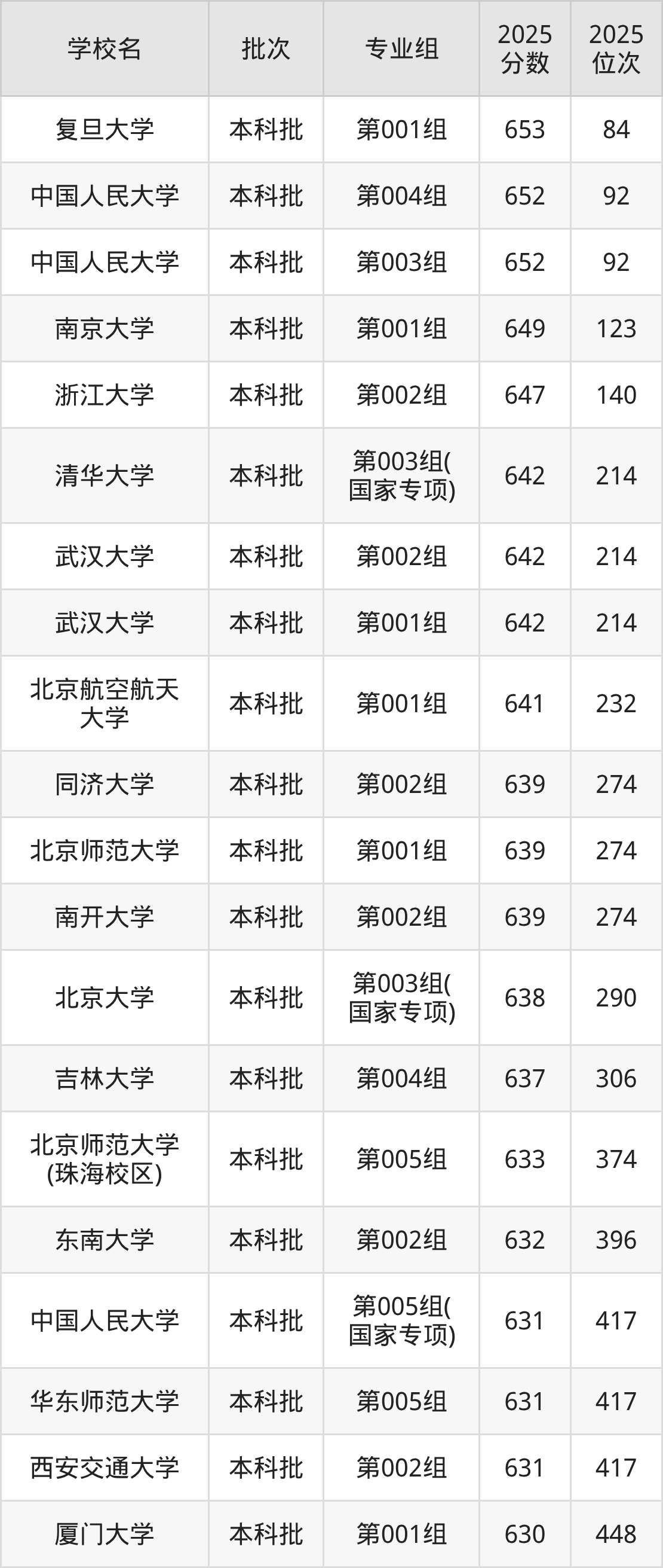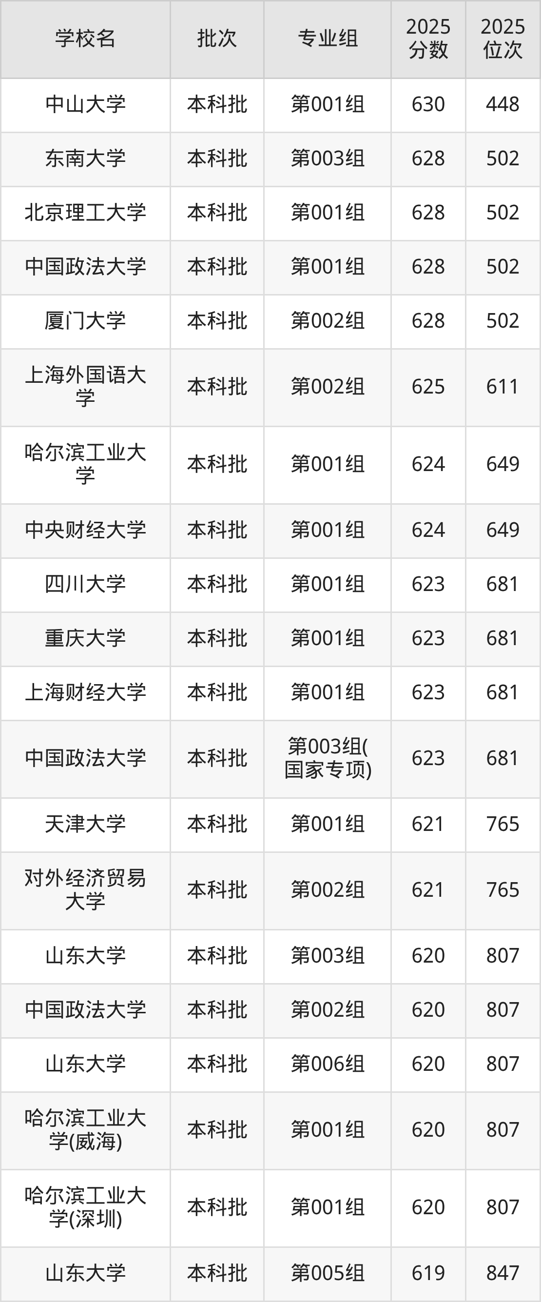 另外录取位次低于该区间(较稳妥)的有中央财经大学第001组(649名)、哈尔滨工业大学第001组(649名)等;录取位次高于该区间(可冲)的有厦门大学第002组(502名)、东南大学第003组(502名)等。
