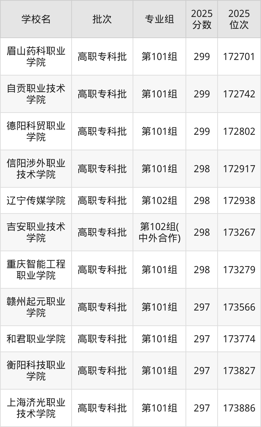 2025年江西高考历史类298分(172917名~173434名)能上的大学有信阳涉外职业技术学院第101组、重庆智能工程职业学院第101组、辽宁传媒学院第102组、吉安职业技术学院第102组(中外合作)。