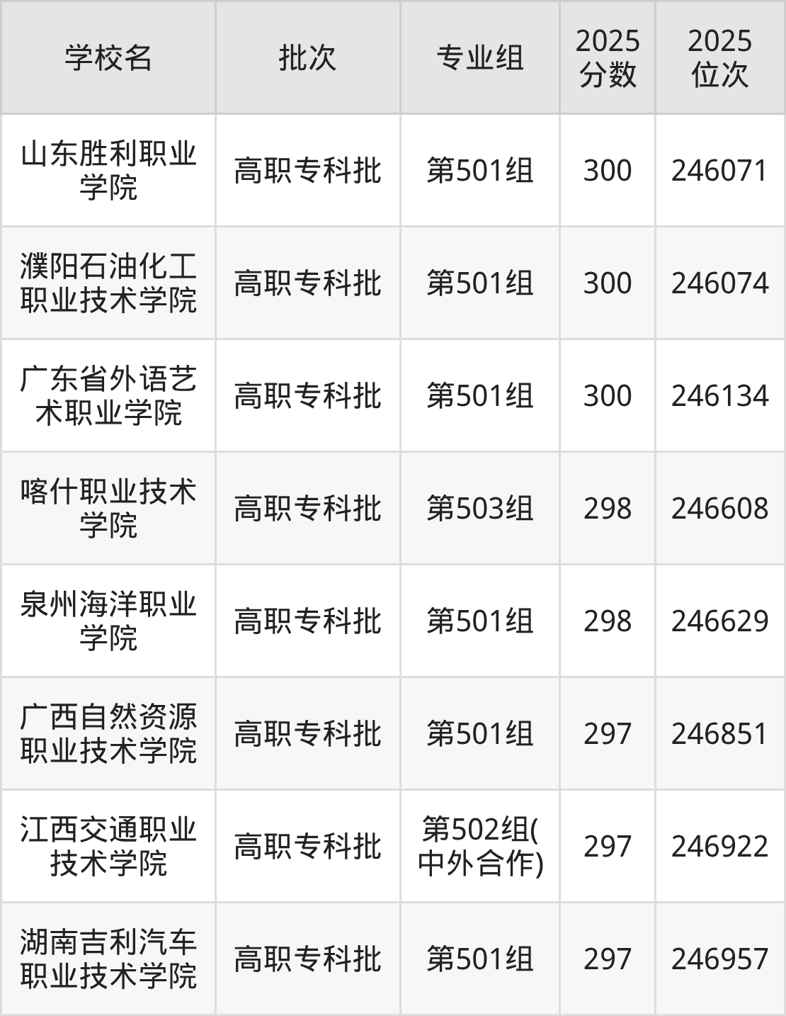 另外录取位次低于该区间(较稳妥)的有广西自然资源职业技术学院第501组(246851名)、江西交通职业技术学院第502组(中外合作)(246922名)等;录取位次高于该区间(可冲)的有广东省外语艺术职业学院第501组(246134名)、濮阳石油化工职业技术学院第501组(246074名)等。