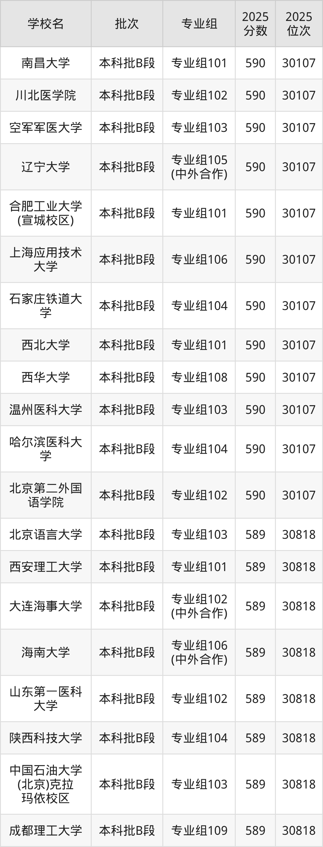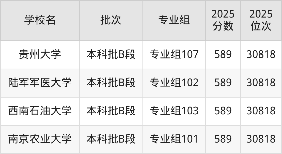2025年四川高考物理类589分(30108名~30818名)能上的大学有山东第一医科大学专业组102、南京农业大学专业组101、西南石油大学专业组103、陆军军医大学专业组102等。