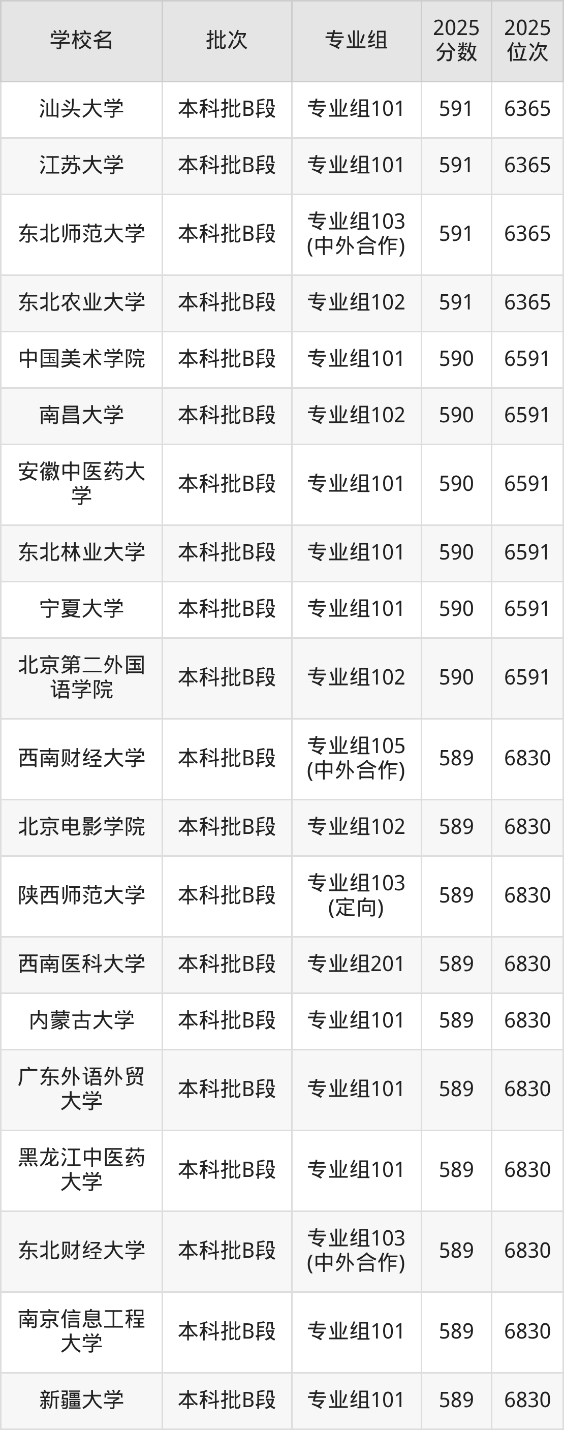 2025年四川高考历史类589分(6592名~6830名)能上的大学有新疆大学专业组101、南京信息工程大学专业组101、西南财经大学专业组105(中外合作)、黑龙江中医药大学专业组101等。