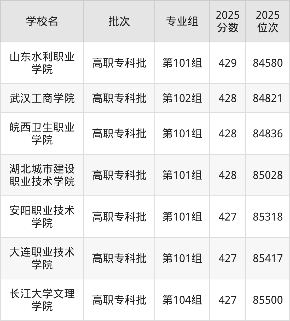 另外录取位次低于该区间(较稳妥)的有安阳职业技术学院第101组(85318名)、大连职业技术学院第101组(85417名)等;录取位次高于该区间(可冲)的有山东水利职业学院第101组(84580名)、广西职业技术学院第101组(83924名)等。