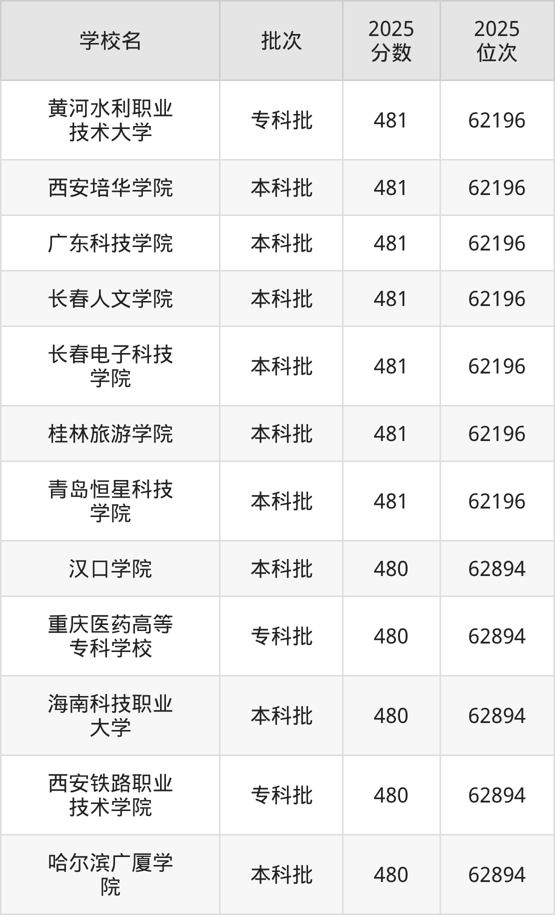 2025年河北高考历史类480分(62197名~62894名)能上的大学有海南科技职业大学、西安铁路职业技术学院、汉口学院、哈尔滨广厦学院等。