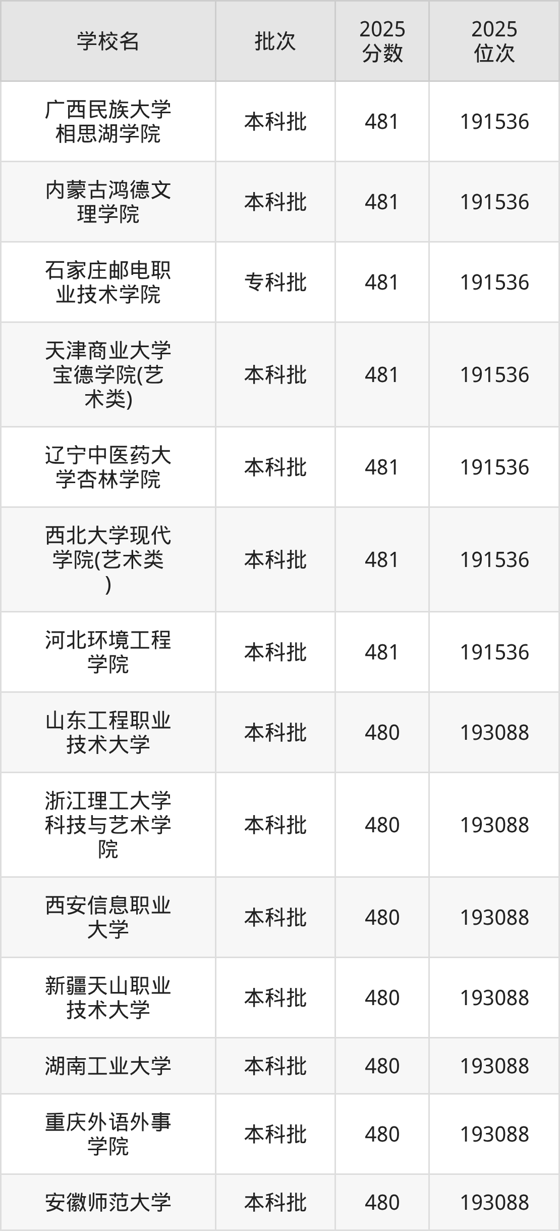 2025年河北高考物理类480分(191537名~193088名)能上的大学有西安信息职业大学、山东工程职业技术大学、新疆天山职业技术大学、安徽师范大学等。