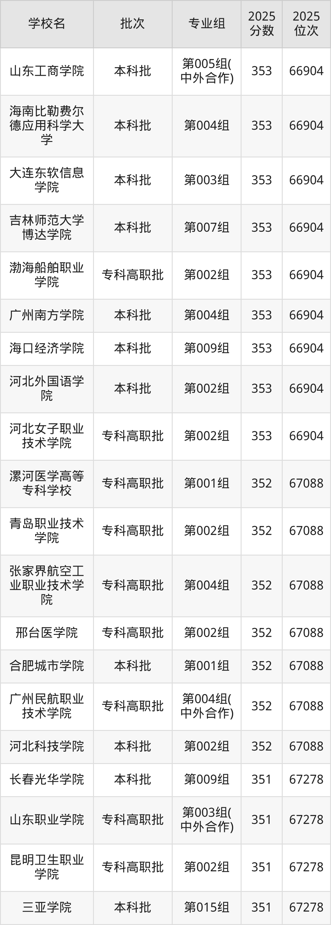 2025年吉林高考物理类353分(66724名~66904名)能上的大学有河北外国语学院第002组、大连东软信息学院第003组、吉林师范大学博达学院第007组、山东工商学院第005组(中外合作)等。
