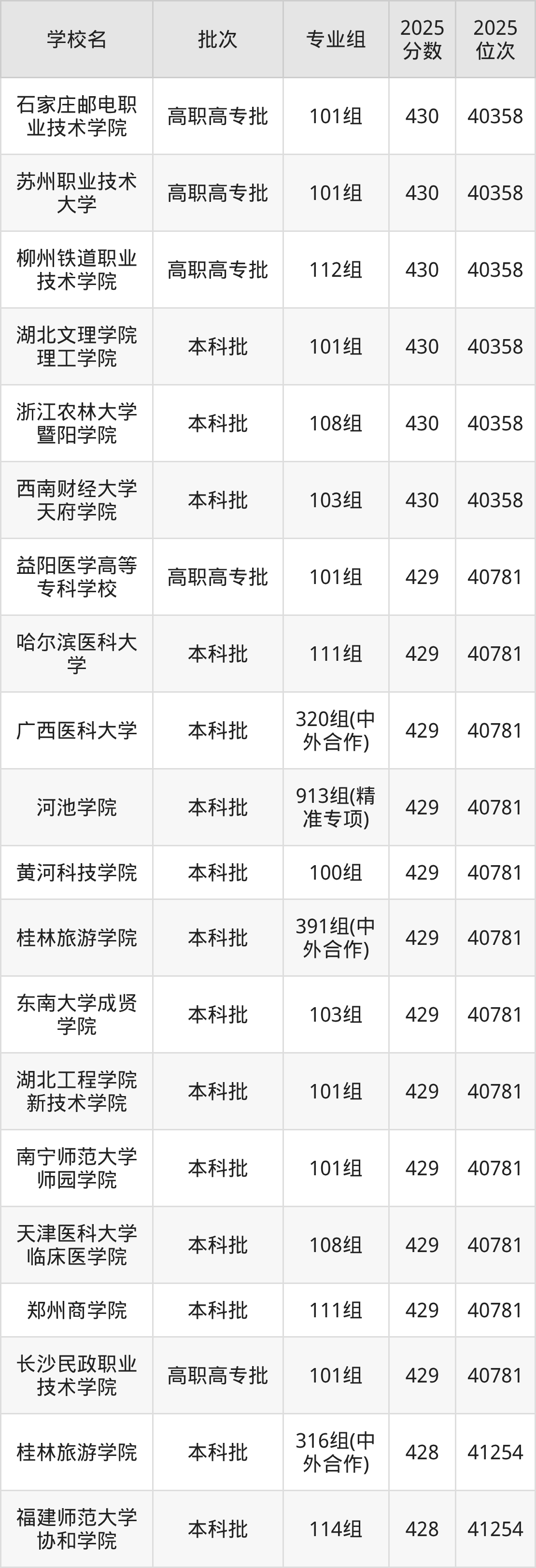 2025年广西高考历史类428分(40782名~41254名)能上的大学有桂林旅游学院316组(中外合作)、重庆工程学院106组、长江大学文理学院100组、长江大学文理学院101组等。