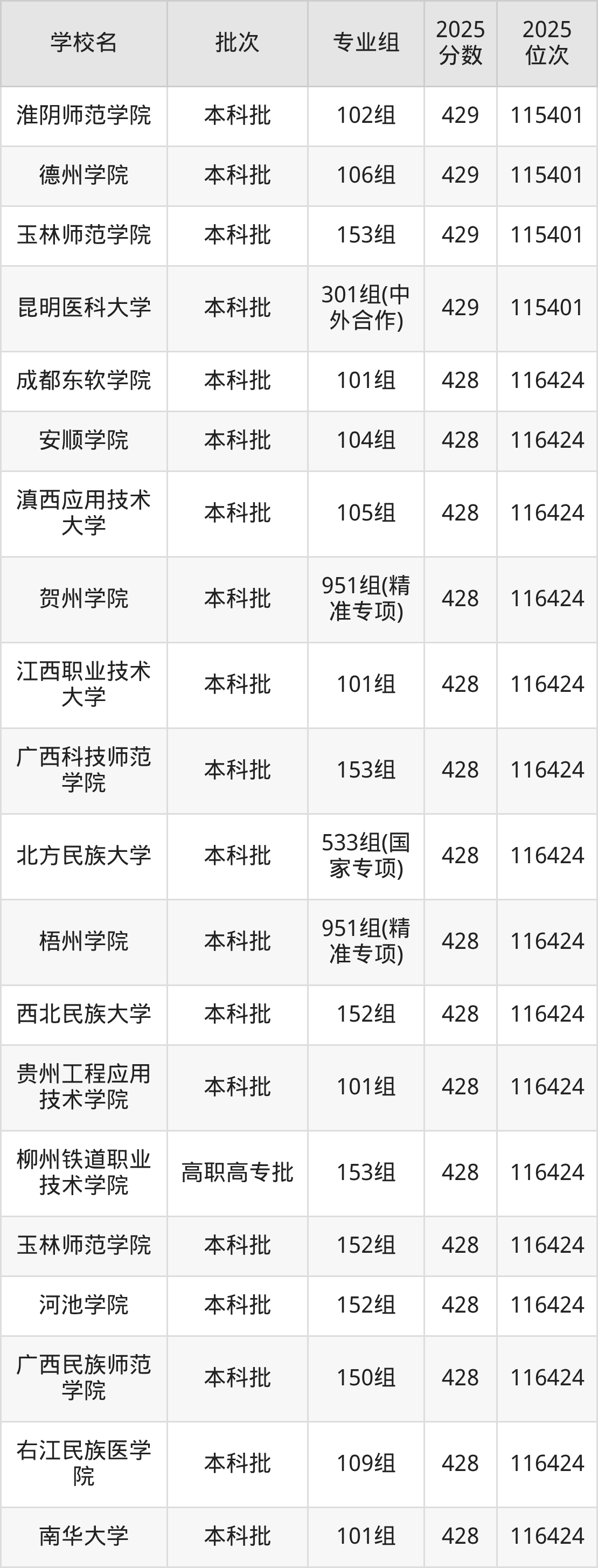 广西高考428分:历史类排名41254位、物理类排名116424位。该分数位次对应能上的大学历史类有桂林旅游学院316组(中外合作)、重庆工程学院106组;物理类有天津农学院152组、邯郸学院101组,更多名单如下文所示,2026届考生可参考。