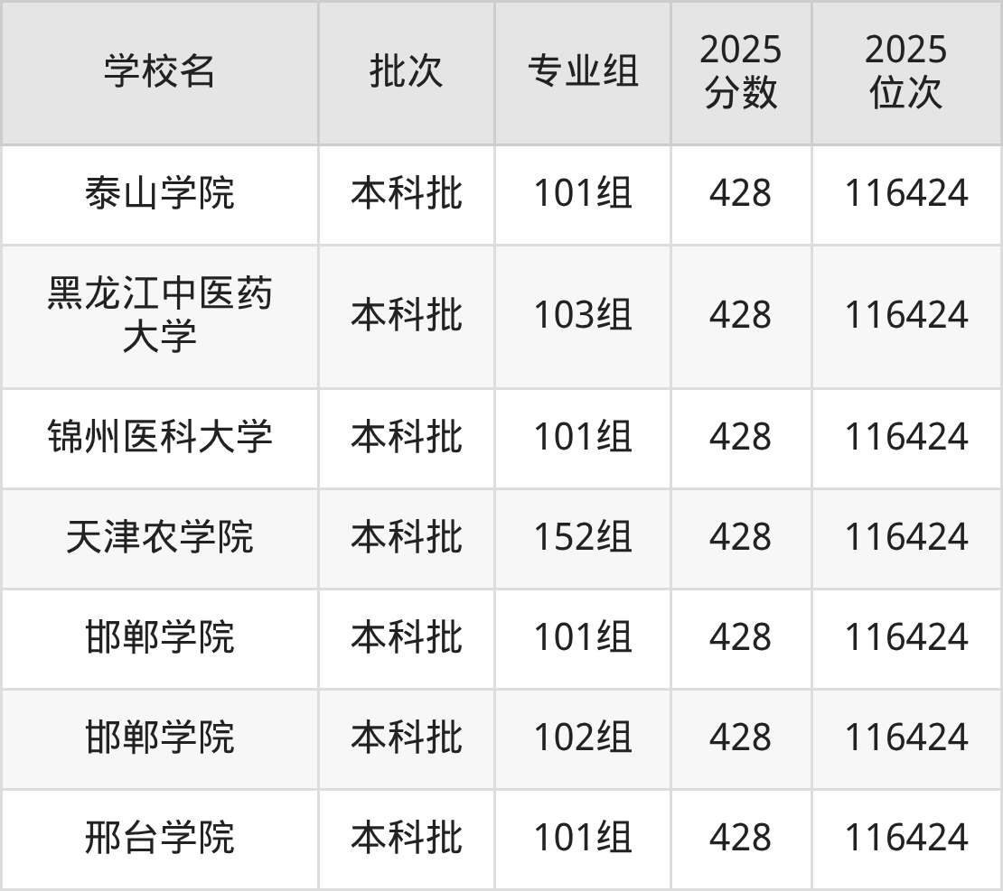 2025年广西高考物理类428分(115402名~116424名)能上的大学有天津农学院152组、邯郸学院101组、邯郸学院102组、邢台学院101组等。