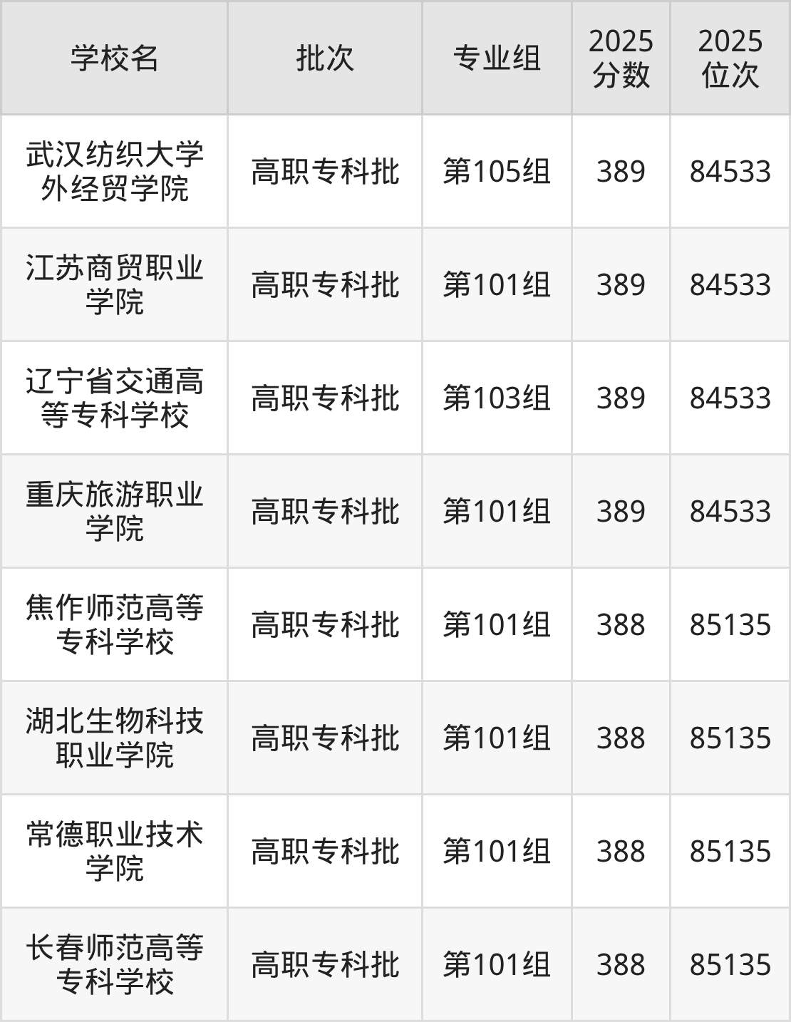 2025年湖南高考历史类388分(84534名~85135名)能上的大学有长春师范高等专科学校第101组、焦作师范高等专科学校第101组、常德职业技术学院第101组、湖北生物科技职业学院第101组。